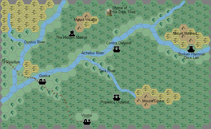 Giampaolo made this map for his River of Blood adventure, set on the upper course of the Achelos River. The scale may seem a bit confusing at first, until you realise that it’s one sixth of 8 miles per hex. He later used a related scale of 2.7 miles per hex for more maps of the same area.