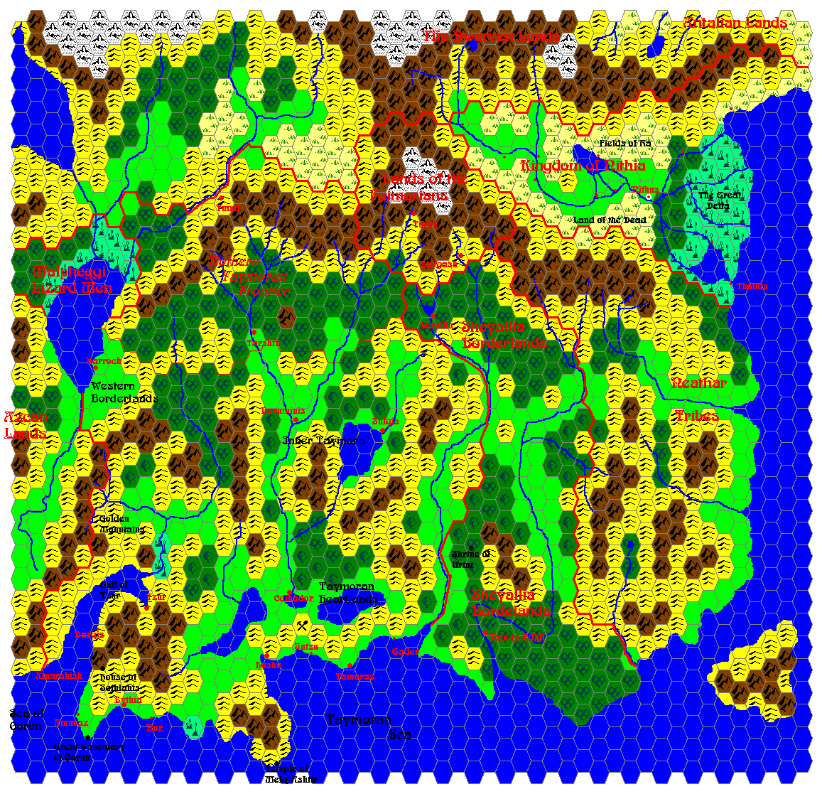 Then, in September 2002, Giampaolo took James’s Taymora, 24 miles per hex map and added settlements and national boundaries. This is the map featured second below. It later turned out that James had placed settlements in his initial hand-drawn map, but unfortunately he didn’t share it until 2015, so the locations don’t match with Giampaolo’s.