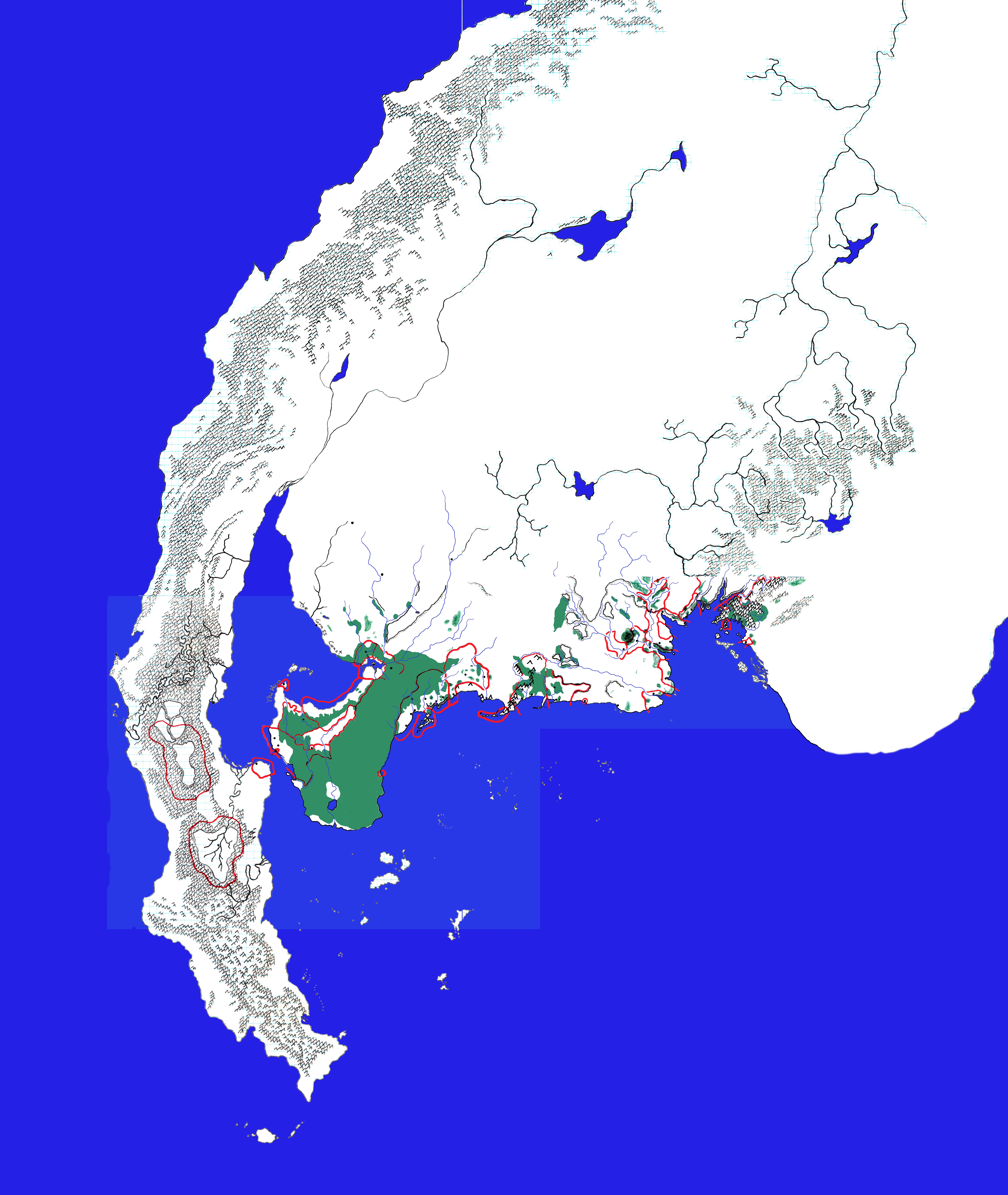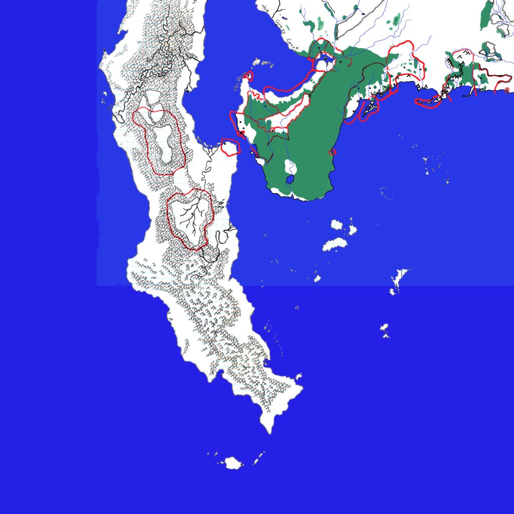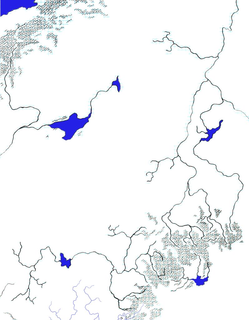 Unlike many fan-made maps of this region, Eric seems to have based his terrain primarily on the Companion Set map of Brun. The river system in the northeast is entirely his own invention, logically extending the drainage north of the Black Mountains that was featured on the edge of X4’s Great Waste map.