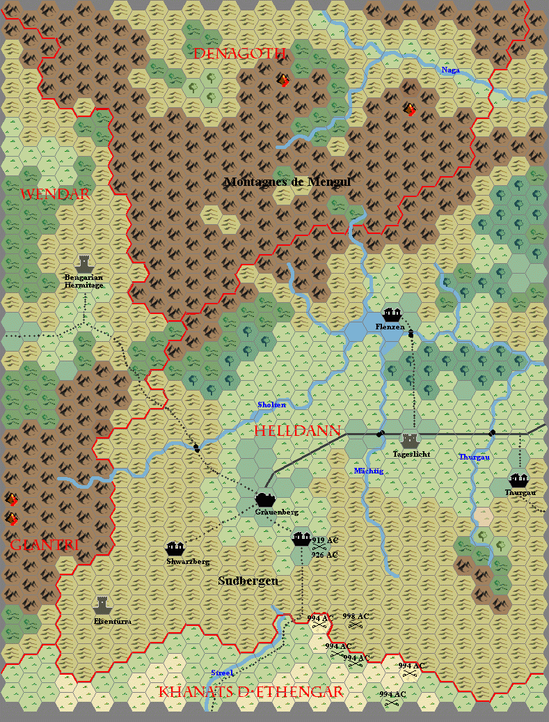 This is a fan-made map. It was published in September 2002. The updated Atlas version of this map is Heldann, 8 miles per hex. See also Appendix C for annual chronological snapshots of the area. For the full context of this map in Mystara’s publication history, see the upcoming Let’s Map Mystara 2002.