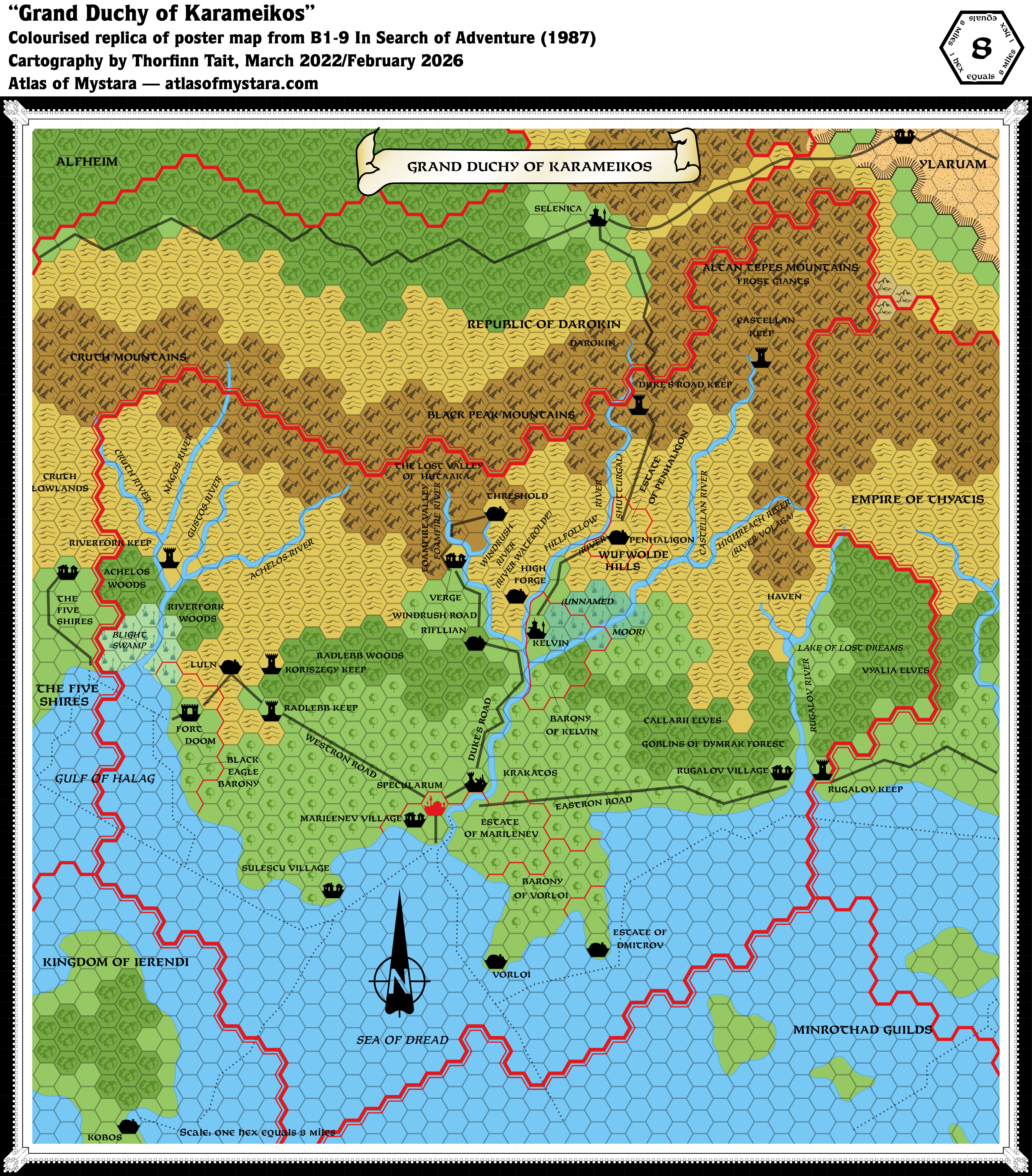 This map appeared in the B1-9 In Search of Adventure super module. It was released just two months after GAZ1 The Grand Duchy of Karameikos, and it’s mostly just a very close replica of GAZ1’s Karameikos map. The borders of this one have been expanded ever so slightly. The original was in black and white, so I have used the colours from GAZ1’s map to provide terrain types for white hexes.