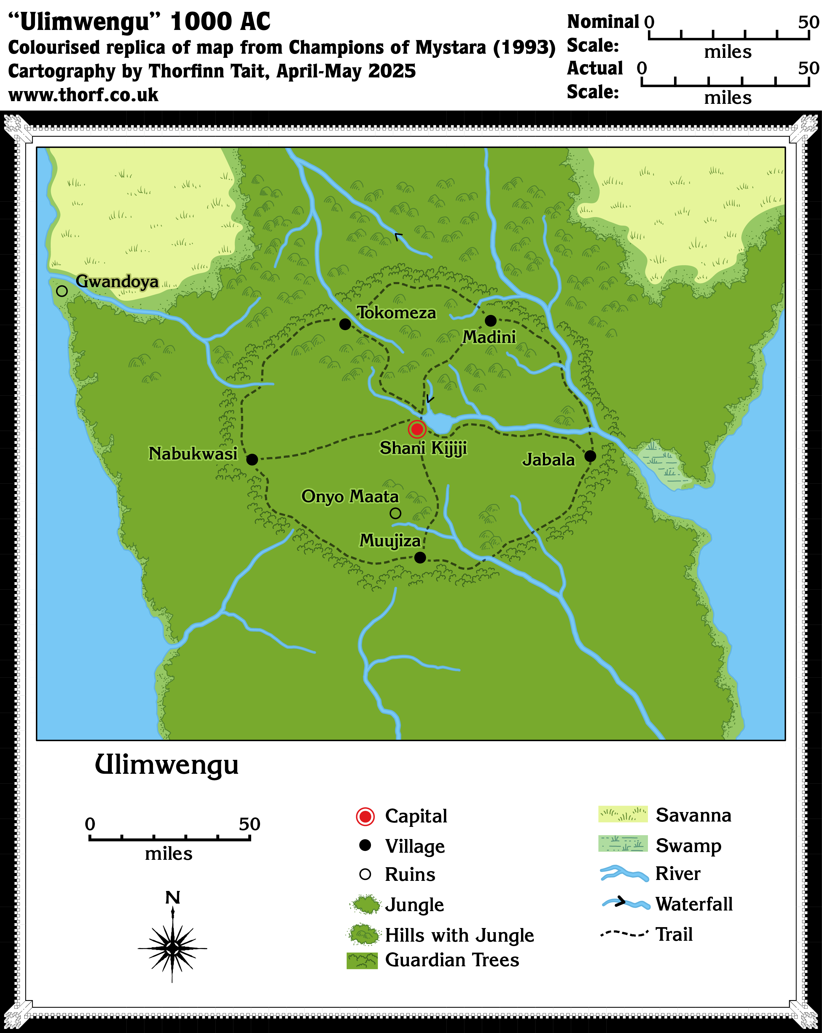 This is one of two maps of Ulimwengu. The other was a town map of its capital, Shani Kijiji. Since Ulimwengu is a hidden country, only its border appeared on the 24 mile per hex Serpent Peninsula map. This map, which did not have hexes, is nonetheless the equivalent of an 8 mile per hex map of the nation.