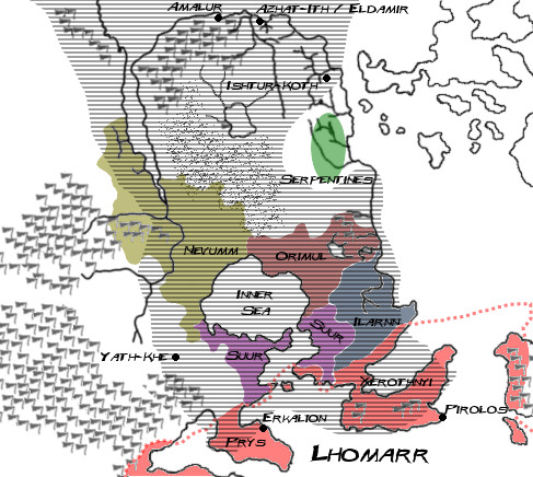 This first map builds on Geoff’s Lhomarr map, though it concentrates on Davania, and adds in neighbouring lands. By this time, mappers such as JTR, Michele Carpita, and John Calvin had all created pre-cataclysmic maps of this area, and Christian likely referenced some or all of these. But he also added new details, such as the extents of each realm.