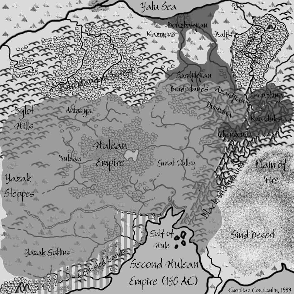 Of the four maps Christian posted to kick off his Hule project on the Mystara Mailing List, only one was a hex map; the other three were historical maps showing the extent of the Hulean Empire at various stages of its history.