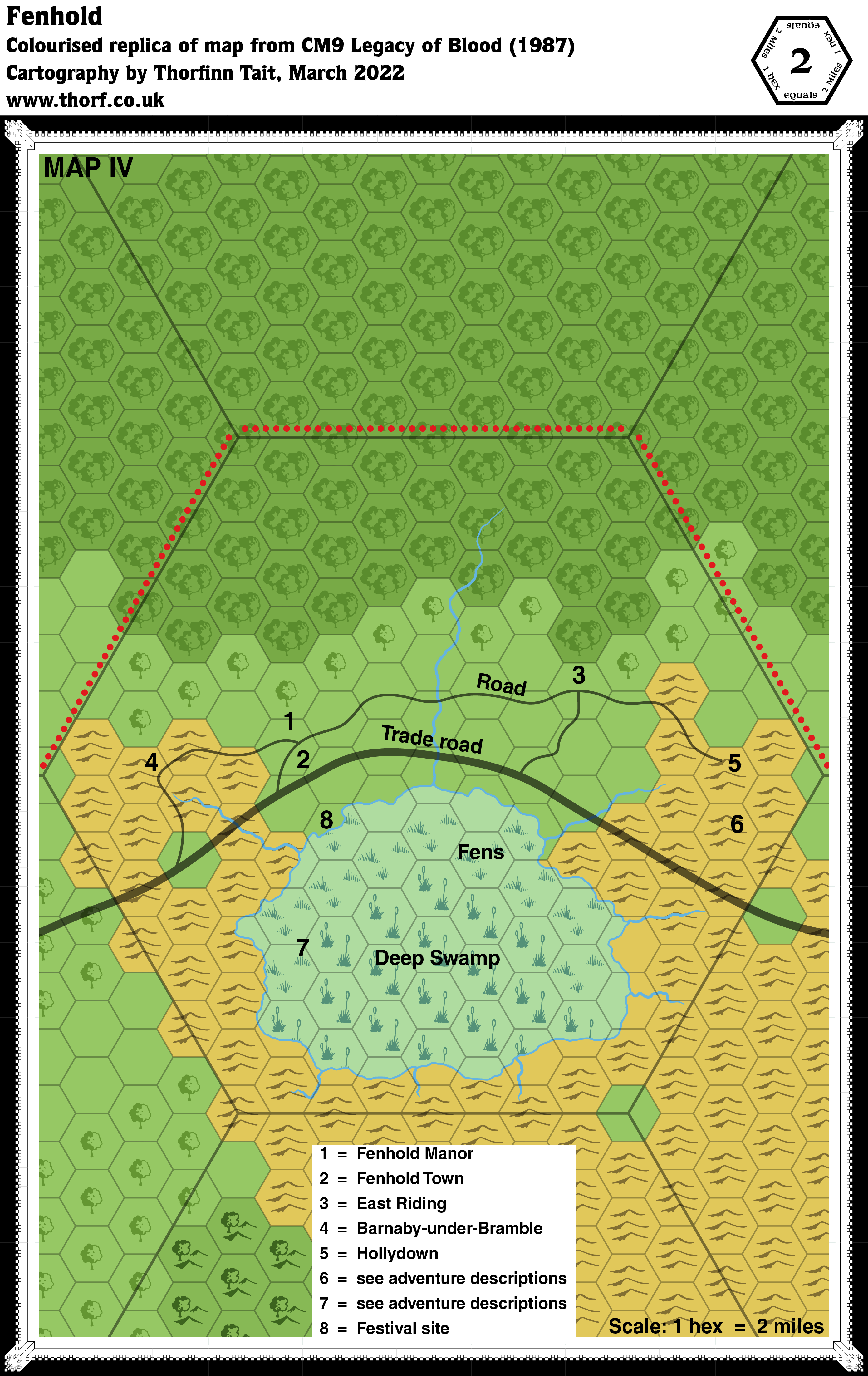 The close-up map of the dominion of Fenhold in CM9 was a 2 mile per hex map. But its hexes were printed very large — more than double normal size. Strangely, it included no settlement symbols, instead using a numbered key to perform that role. This, too, is slightly peculiar, as there was surely more than enough room on the map to include the labelled symbols. Perhaps the reasoning was that the map should be kept as clean as possible to maximise its use as a player dominion.