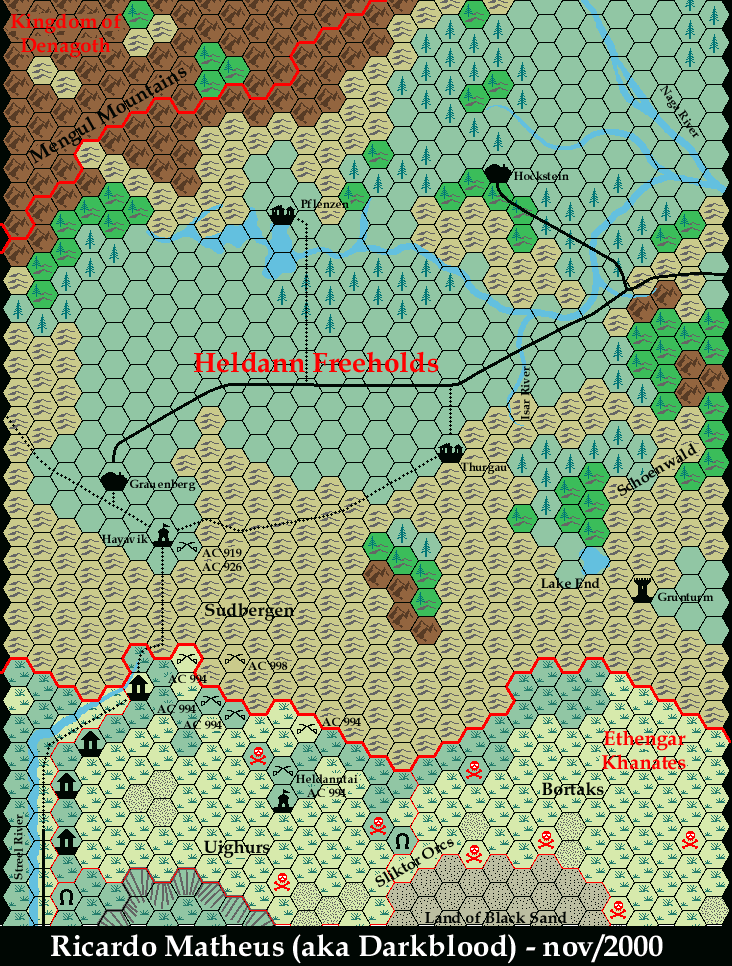 This is a fan-made map. It was published in 2000. The updated Atlas version of this map is Ethengar, 8 miles per hex; Heldann is not yet available. See also Appendix C for annual chronological snapshots of the area. For the full context of this map in Mystara’s publication history, see the upcoming Let’s Map Mystara 2000. (Please note that it may be some time before the project reaches this point.)