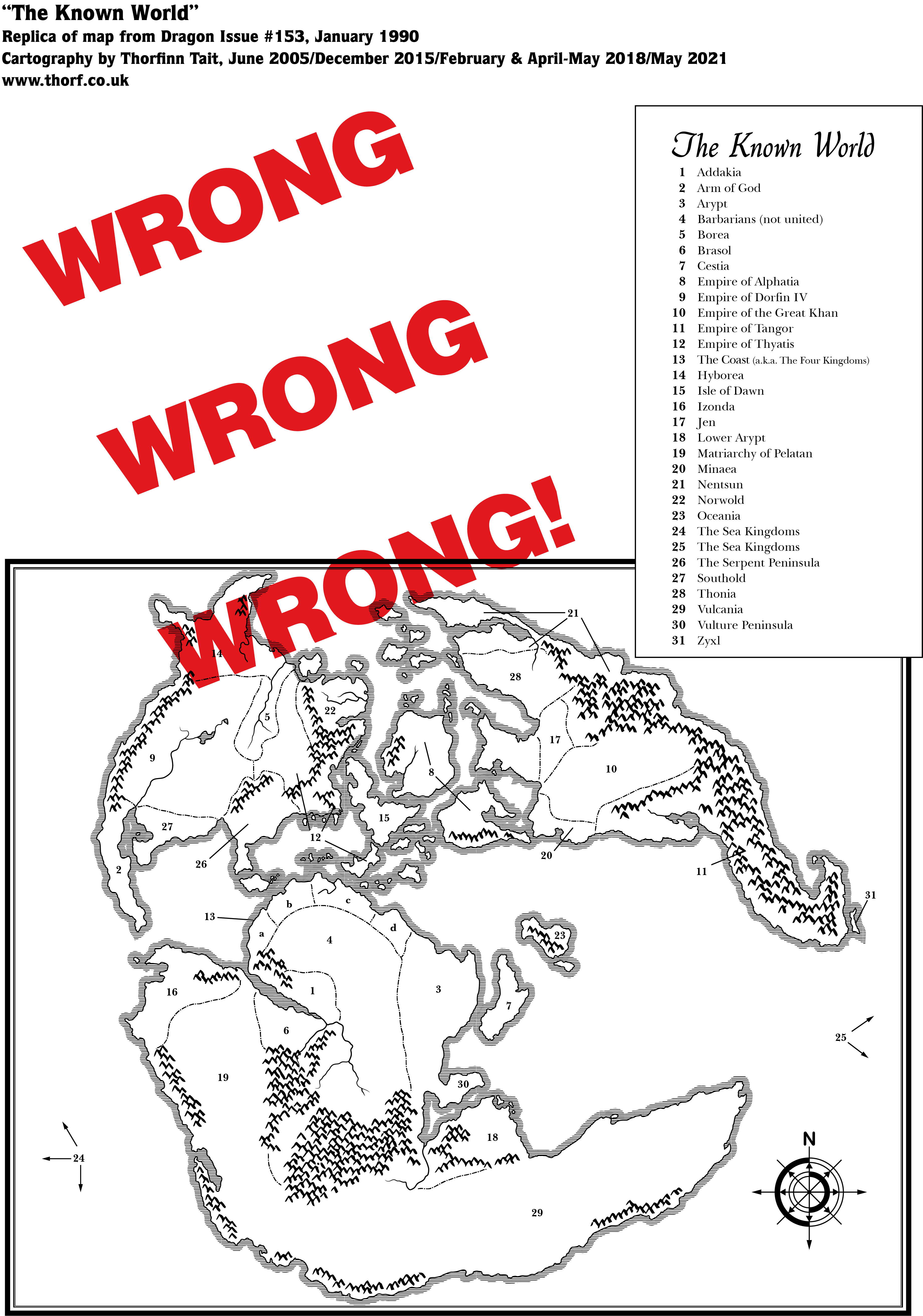 The first episode of the Voyage of the Princess Ark series in January 1990 presented a reprint of the 1985 Master Set‘s world map, with the rather hyperbolic red text, “WRONG WRONG WRONG!” overlaid on top. The article itself was the springboard for Haldemar and his flying ship’s illustrious explorations of Mystara, and it was very much written around this map.
