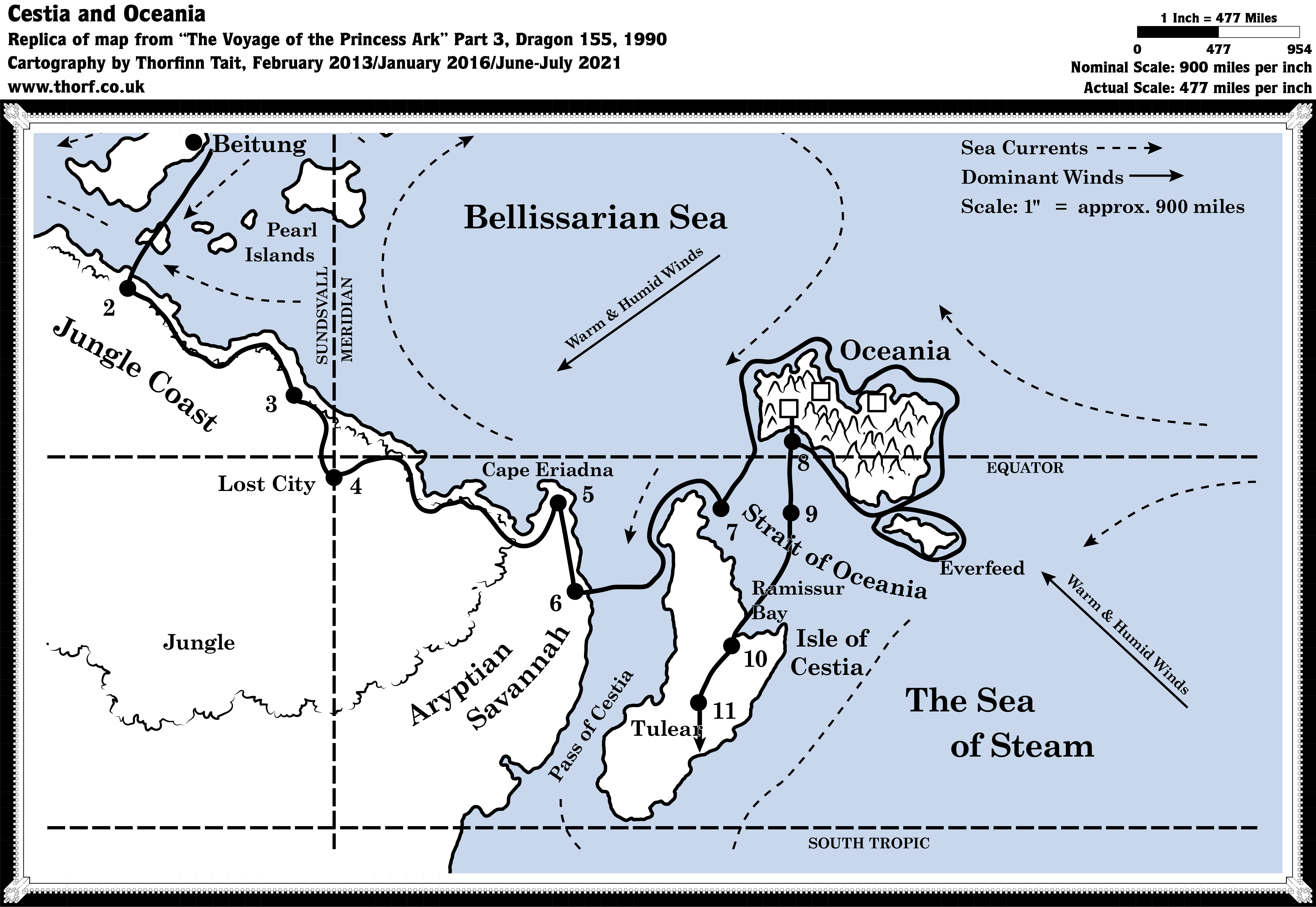 The second flight course map featured in Bruce Heard’s Voyage of the Princess Ark series, in Dragon Magazine. This map is significant because it is the first to show the position of the equator, in addition to providing some geographic and political names for the region. The simple line art maps were eventually replaced with full colour hex maps when the Princess Ark reached Sind and moved on to the Savage Coast.