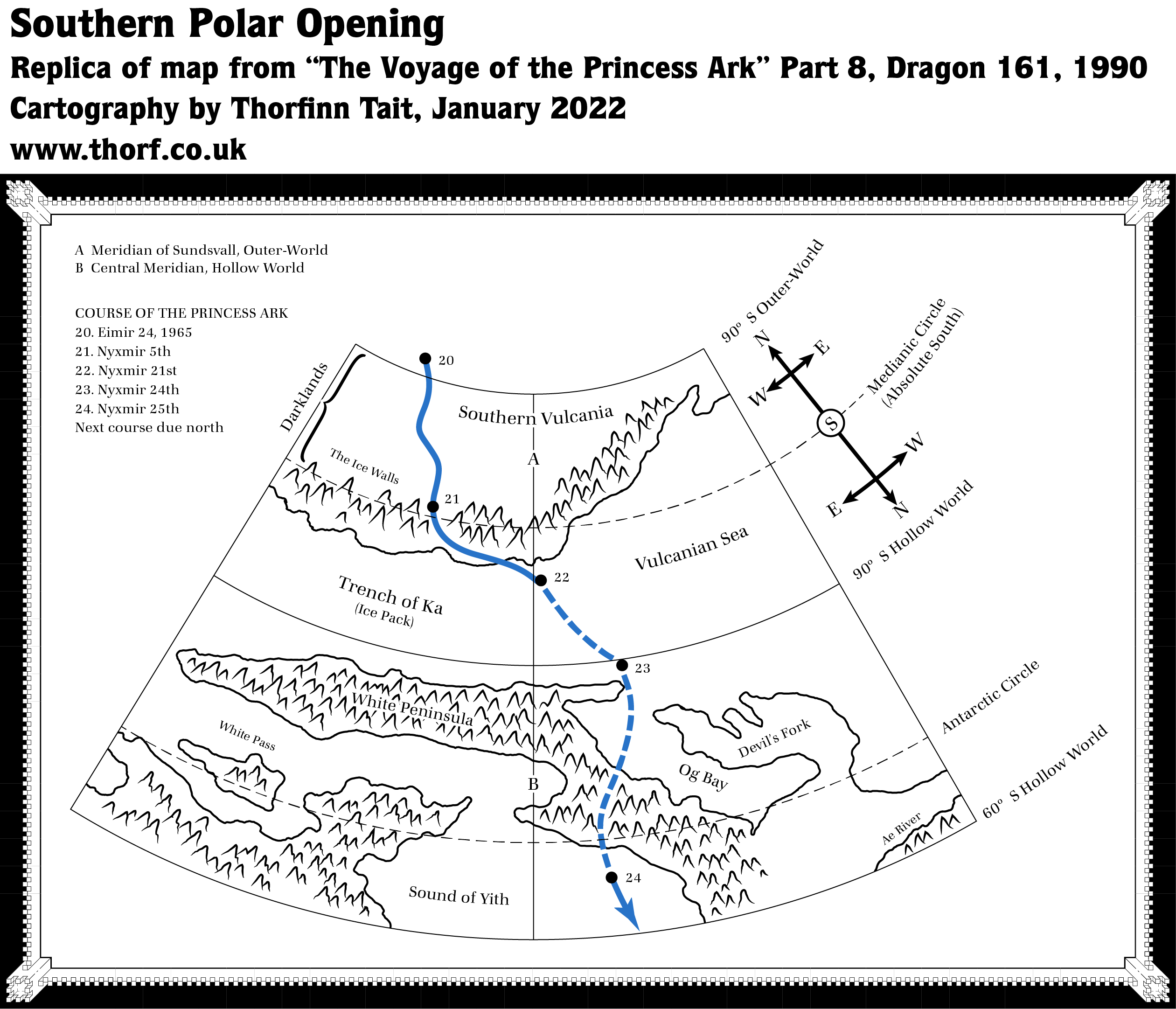 This map came in between the two rather different mapping series of the Voyage of the Princess Ark series. In some ways it’s an extension of the first series, as it is a course map following the journey of the famous skyship. It’s certainly not a hex map, as the second series would be. But this map is also rather special, because instead of showing an extract from the Master Set world map, it shows an up-close snapshot of a section of the southern polar opening — introduced just the previous month in the Hollow World Campaign Set. There’s only one other map of this kind, and that’s the one in the Hollow World Set itself.