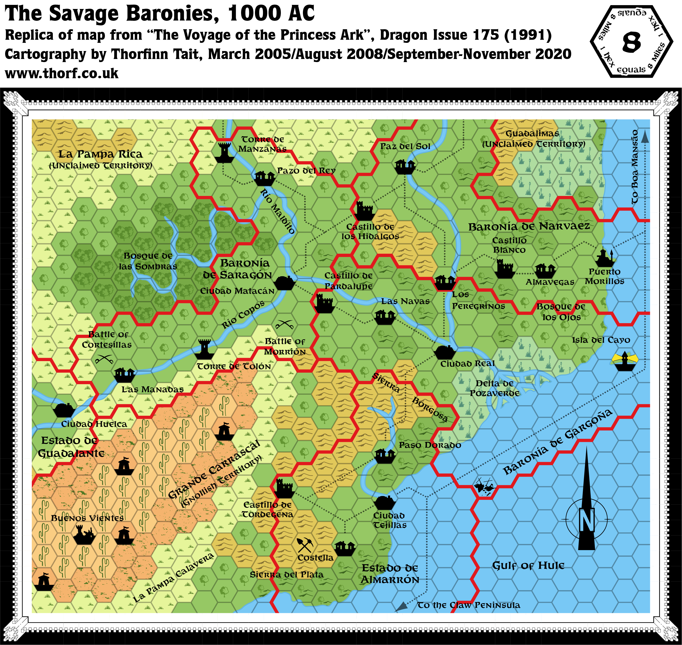 Dragon 175 presented the second of three maps covering the Savage Baronies, continuing Narvaez and introducing Saragón, Gargoña, Almarrón, and the very edge of Guadalante. Almarrón and the adjacent El Grande Carrascal would later feature in the novel, The Black Vessel.