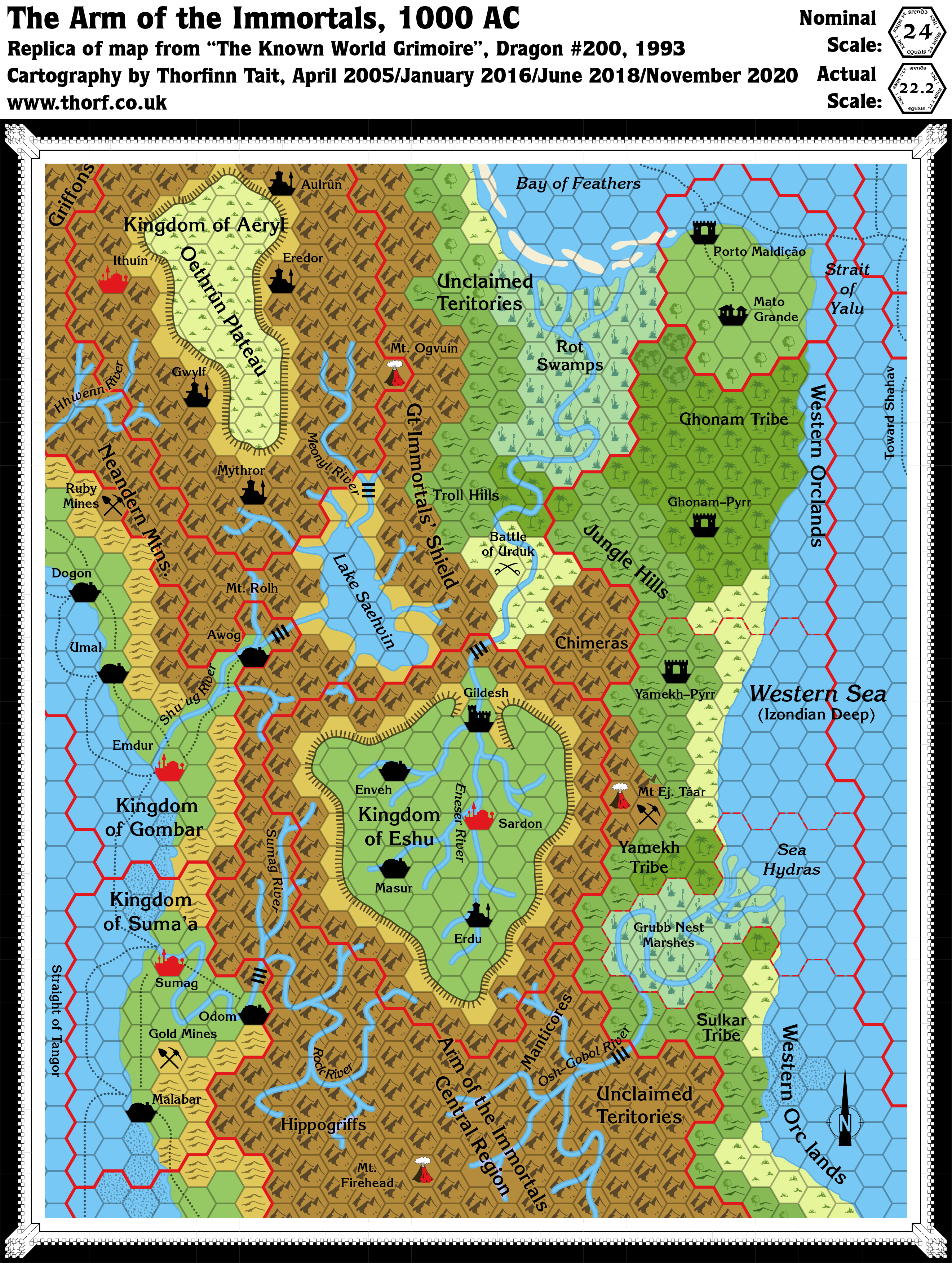 The exact placement of the coastlines in relation to the previous map in Dragon 196 is a little problematic. Reference to the continental and world maps is recommended to work out the exact join here.