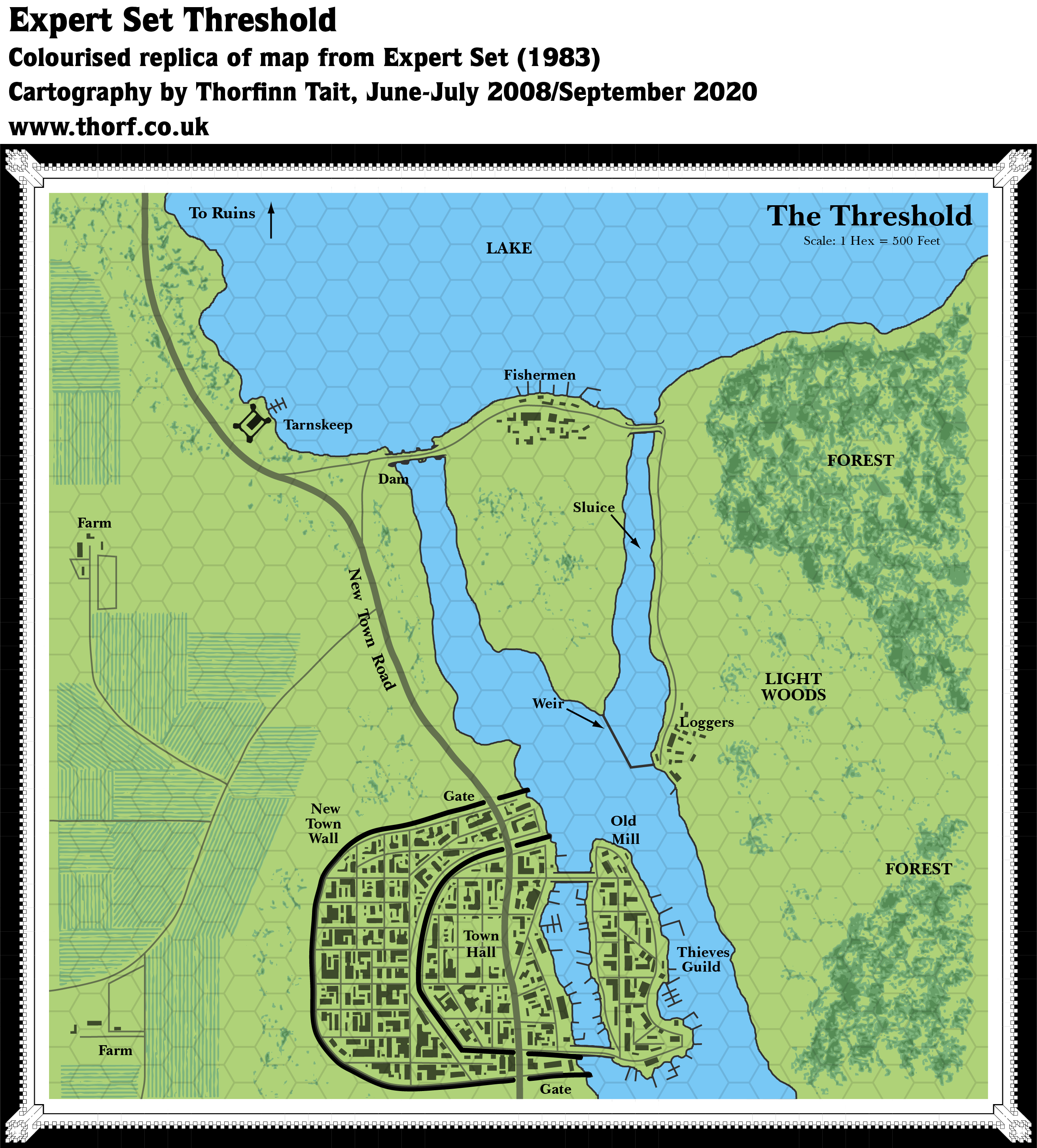 This iconic map was Mystara’s first ever town map, appearing in 1983’s update of the Expert Set. The town of Threshold debuted in this book alongside this map.