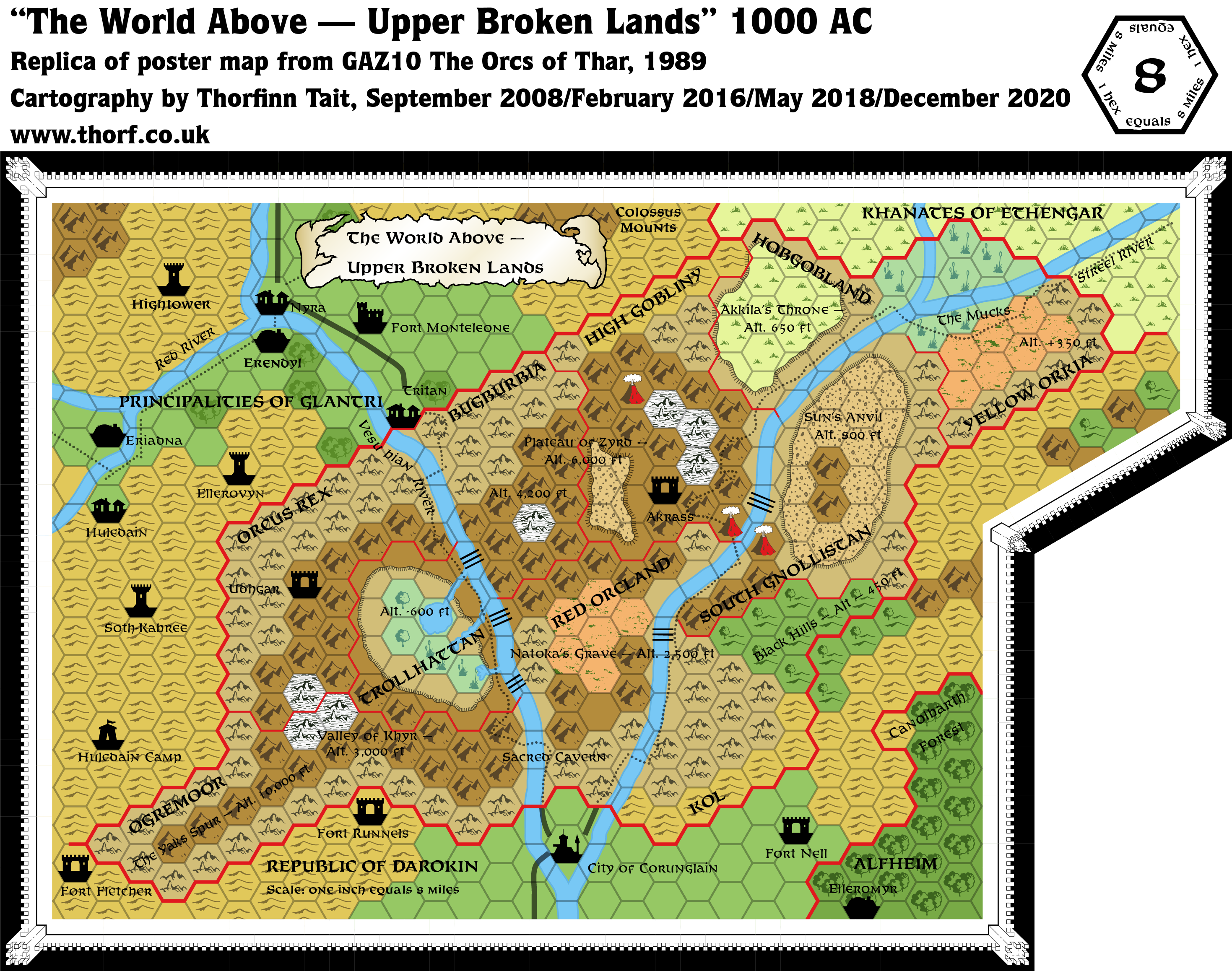 This is Map 104. It was published in January 1989. The updated version of this map is Broken Lands, 8 miles per hex. See also Appendix C for annual chronological snapshots of the area. For the full context of this map in Mystara’s publication history, see Let’s Map Mystara 1989.