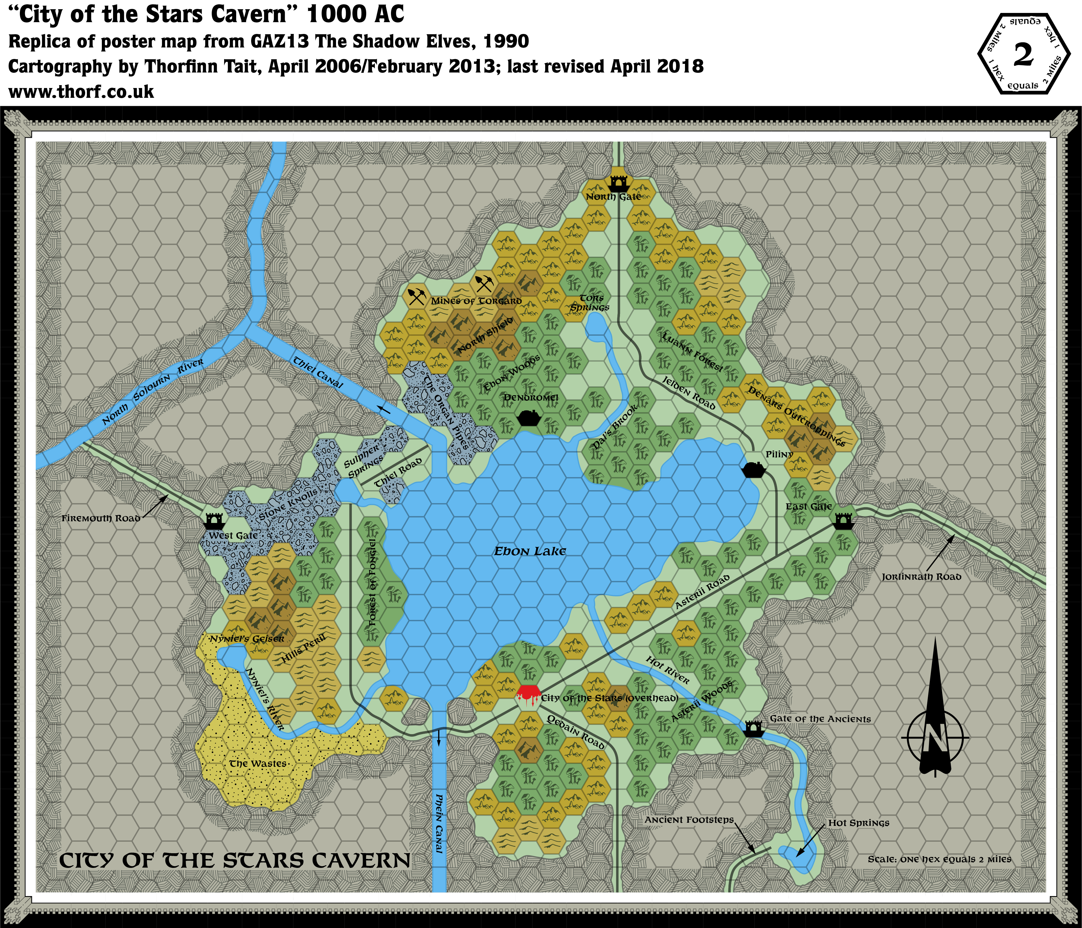 This map saw a return to the 2 miles per hex scale, providing a zoomed in, large scale view of the shadow elves’ Great Cavern. This scale was not used much in Mystara’s maps; it first appeared in a few modules in 1985-1986, but after GAZ13’s cavern map there were no more maps at this scale until fans started to produce zoomed in maps of popular areas. Even later, Bruce Heard made a similar use of the scale in his Alphatia maps.