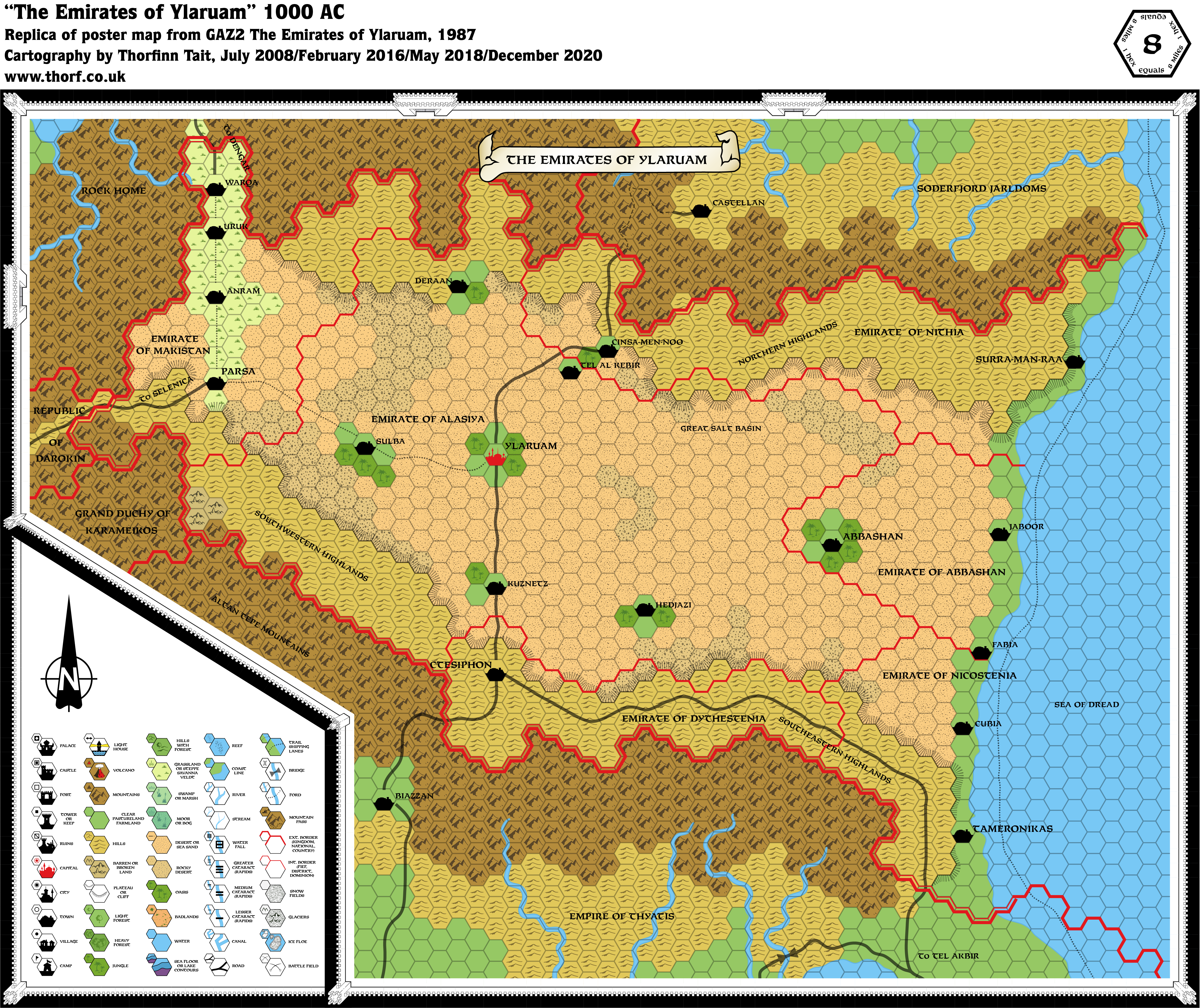 Jauf, Taymor,Tayma,Wahj,Muscat, Dubai,Abu Dubai, Doha,Salwaw,Jubayl, Qaysumah,Nuayriyah, Urayirah,Mubbaraz,Hofuf, Udayliyyah,Haradh,Mishab, Ras al Khafqi,Ras Tannurah, Abu Hadryah,Zilfi,Ghat, Ruywaydah,Shaqra, Diriyah,Dilam, Hillah,Layla,Hariq,Salamiyyah, Artawiyyah, Turayt, Hadithah, Ha’il, Unayzah,Dawadimi, Kasamin,Bishah, Baljurshi, Kahmis Mushayt,Abha, Dirs,Kiyat,Uzan,Lith,Afif,Ulah, Umm Lajj, Duba,Ras al Qasbah, and Haql. When these names are placed on the map, I will note that below. (For now, this applies to Chronological maps of Ylaruam, starting with 1987; eventually the Updated map will also be changed to match these additions.)- In the Emirate of Abbashan, Kiyat, Afif and Mubbaraz have been placed on the coastal plain (GAZ2 p10c).
