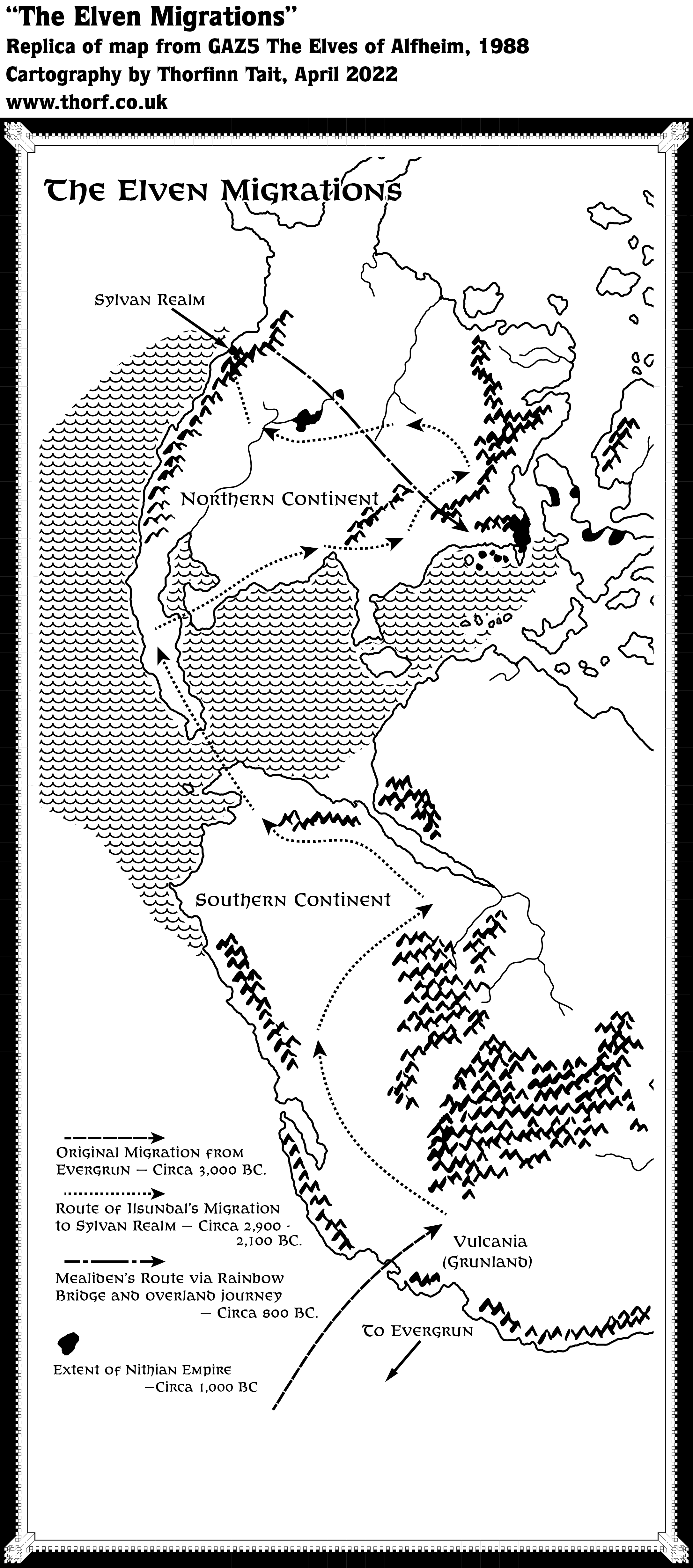 What I truly liked about this map was not only the elven course, but it was the first decent description of CM7’s Location of the Sylvan Realm.Interesting also to see, that where arrows end, in canon then and later Elven settlements have been placed (Vulcania-Vulcanian Elves, Davanian Great Izondian Desert-South-East-North- Unknown locations??, arm Immortals-Ee’aar, Savage Coast-Elves, Sind Desert-Graakhalia, Glantri-Belcadiz, Central Brun-unknown, West Brun/lakes-unknown, Sylvan Realm, Alfheim.