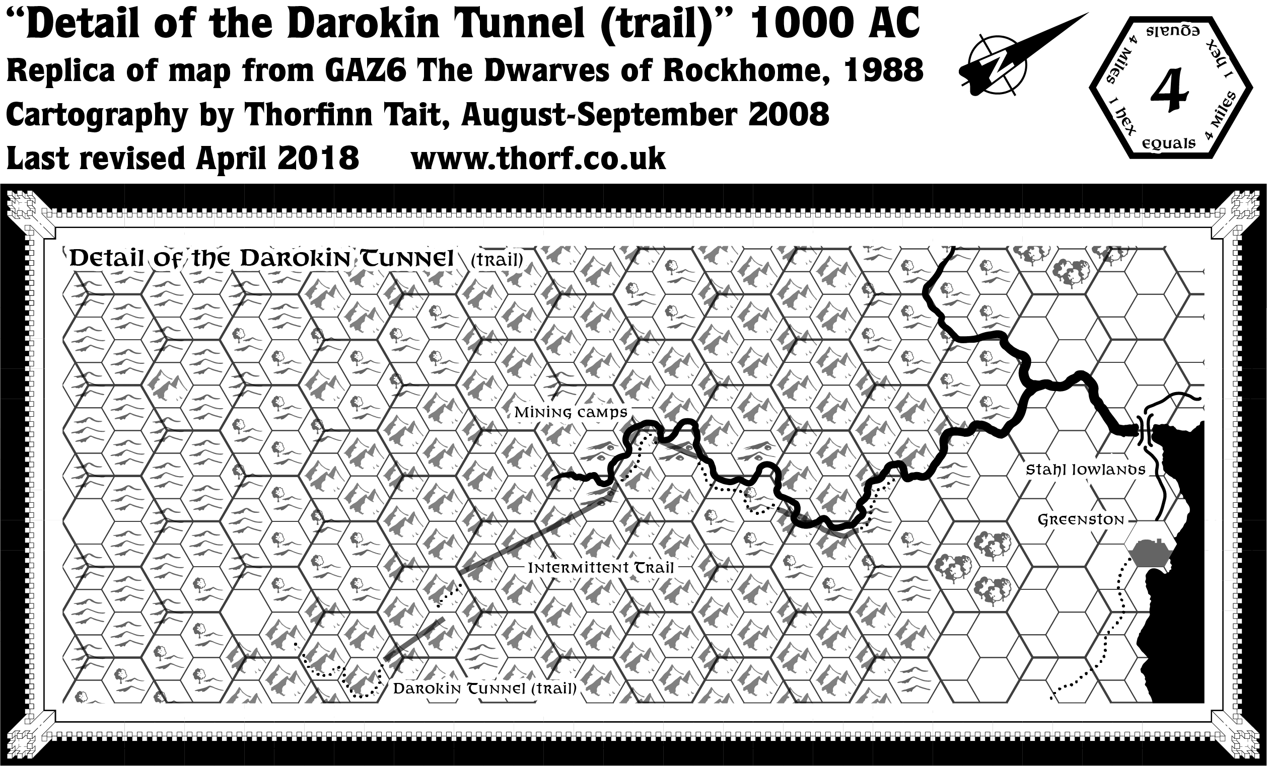 This peculiar little map was drawn on a 60º rotated canvas, with north to the upper right; the strange configuration allowed the whole Darokin Tunnel to be presented in a relatively small space.