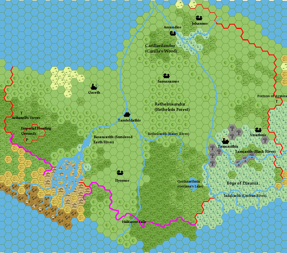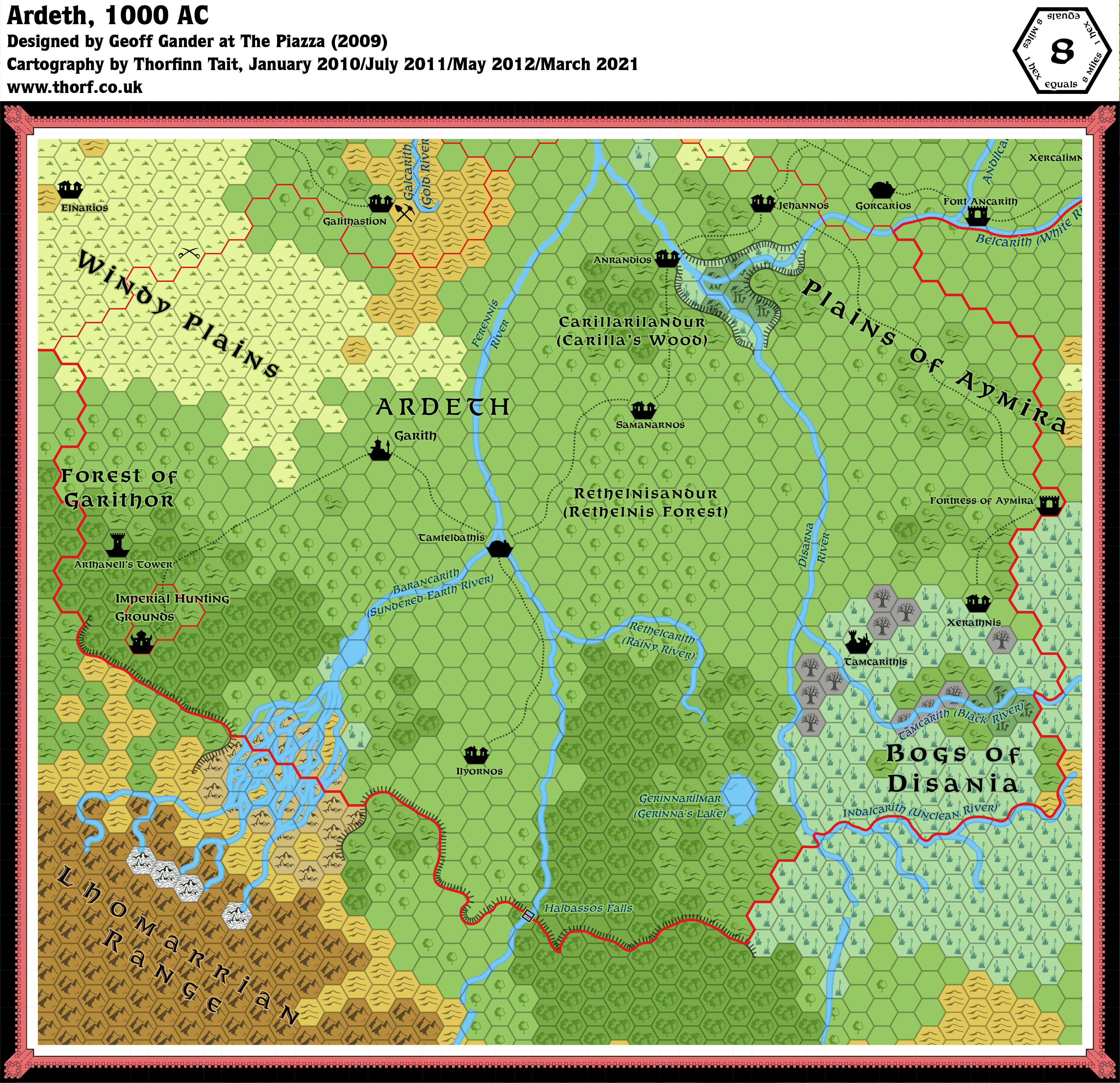 With his seventh Selhomarr map, Geoff moved back to the heartlands in the southern part of the map. The province of Ardeth is one of the largest in the empire, extending from the Windy Plains in the east to the Plains of Aymira in the west, with the Bogs of Disania and the foothills of the Lhomarrian Range in the south.