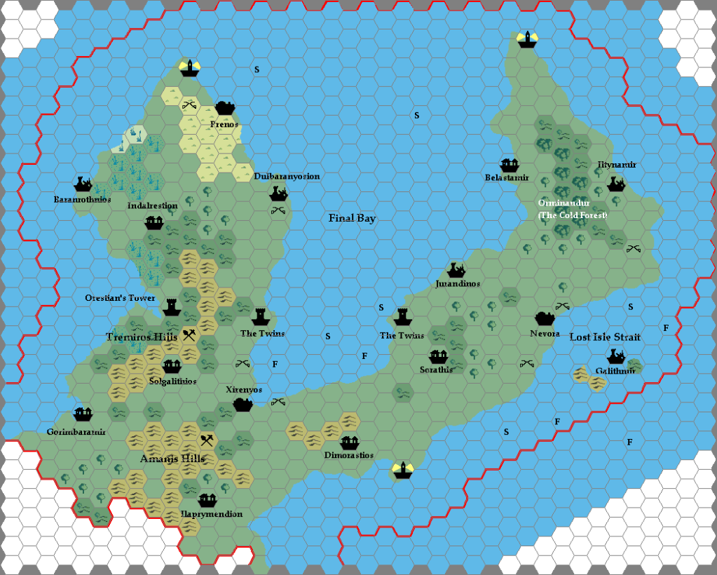 The penultimate part of Selhomarr’s large scale map was the province of Atlissini. Geoff had completed the Tylierian Peninsula at last, and with it the whole southern part of the empire.
