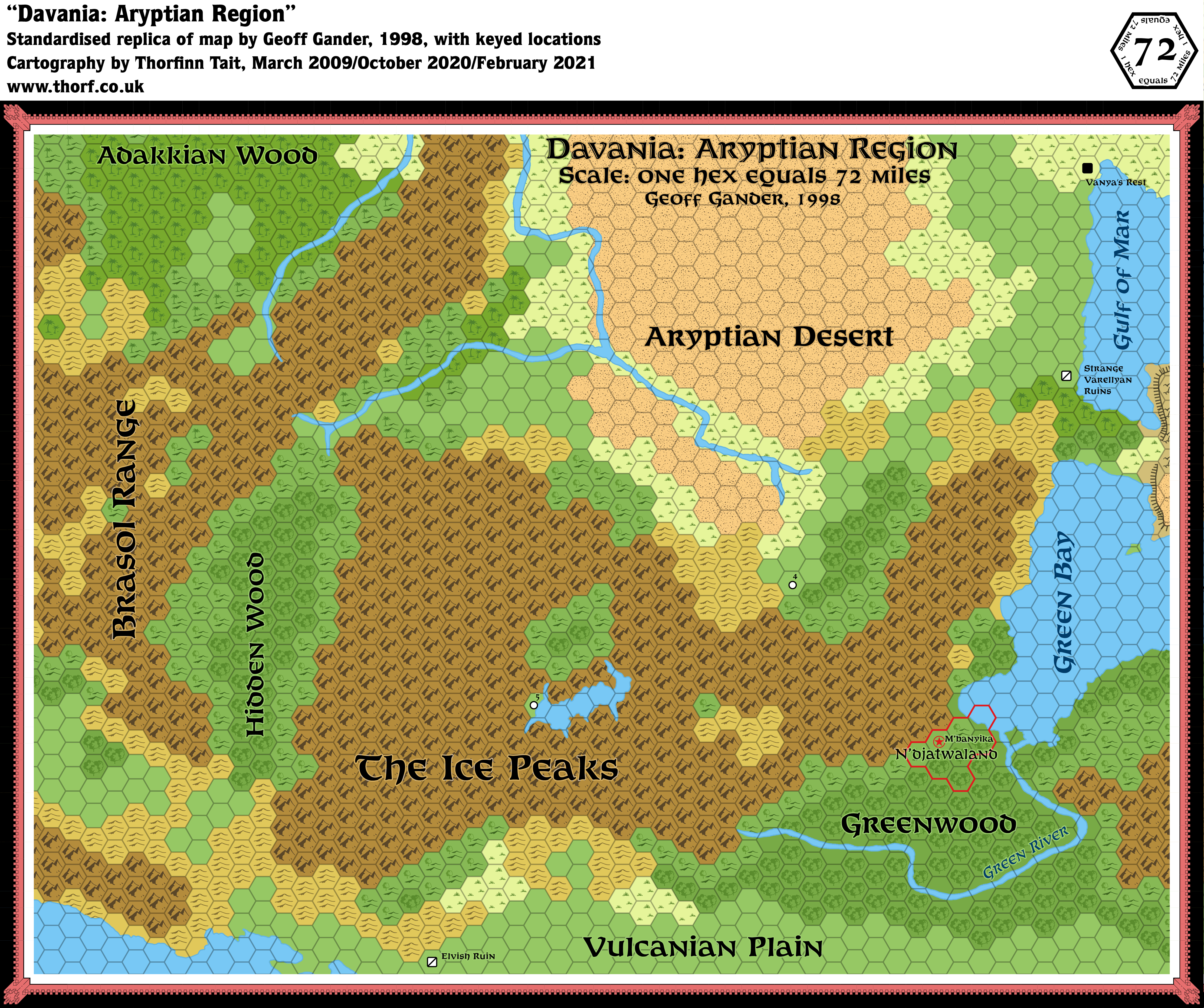 The last part of Geoff’s Davania! The title is “Aryptian Region”, but really this one is a little bit of everything, with parts of Adakkia, Varellya, Vulcania, Green Bay, Brasol, and of course Arypt — specifically, the Aryptian Desert.