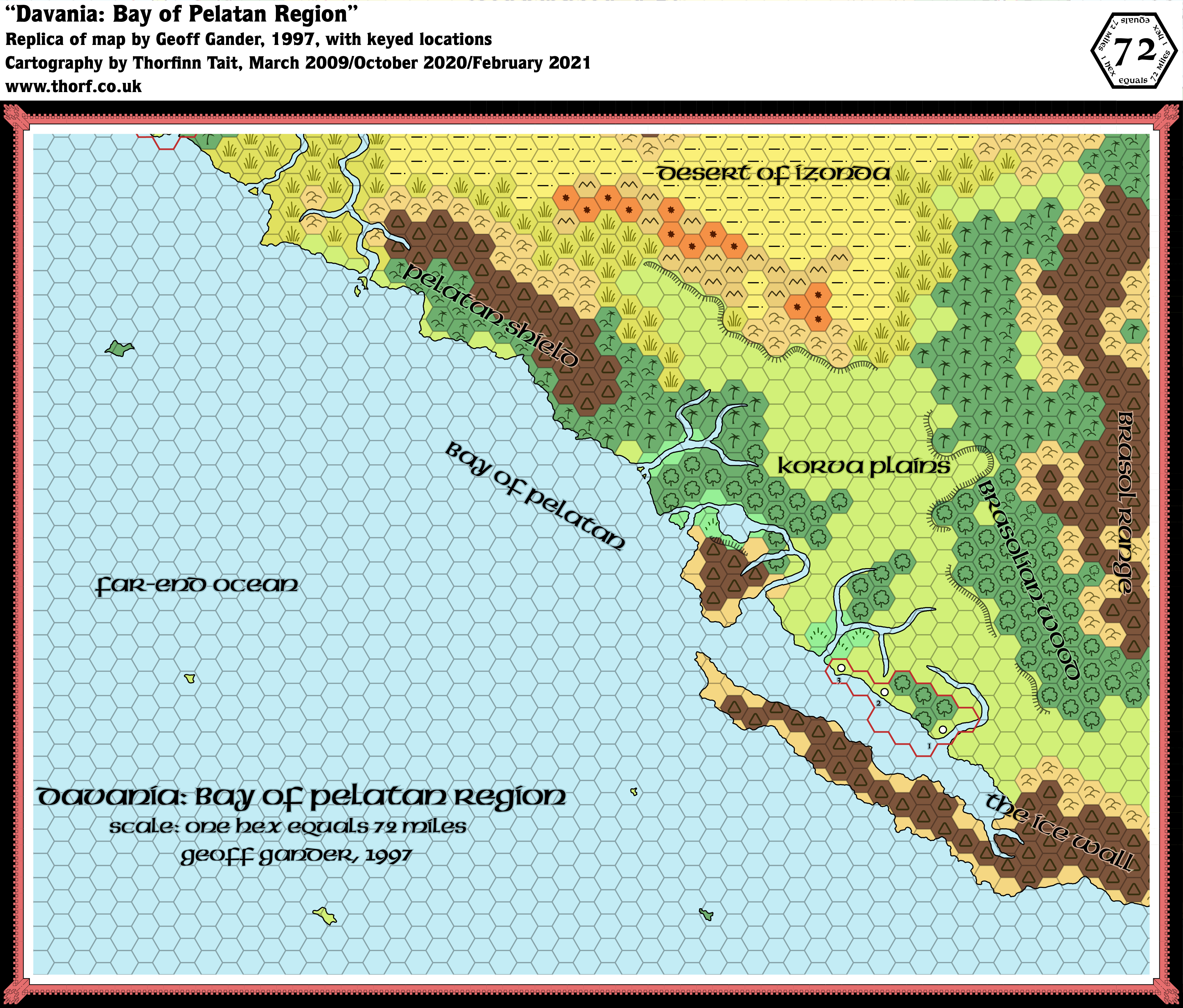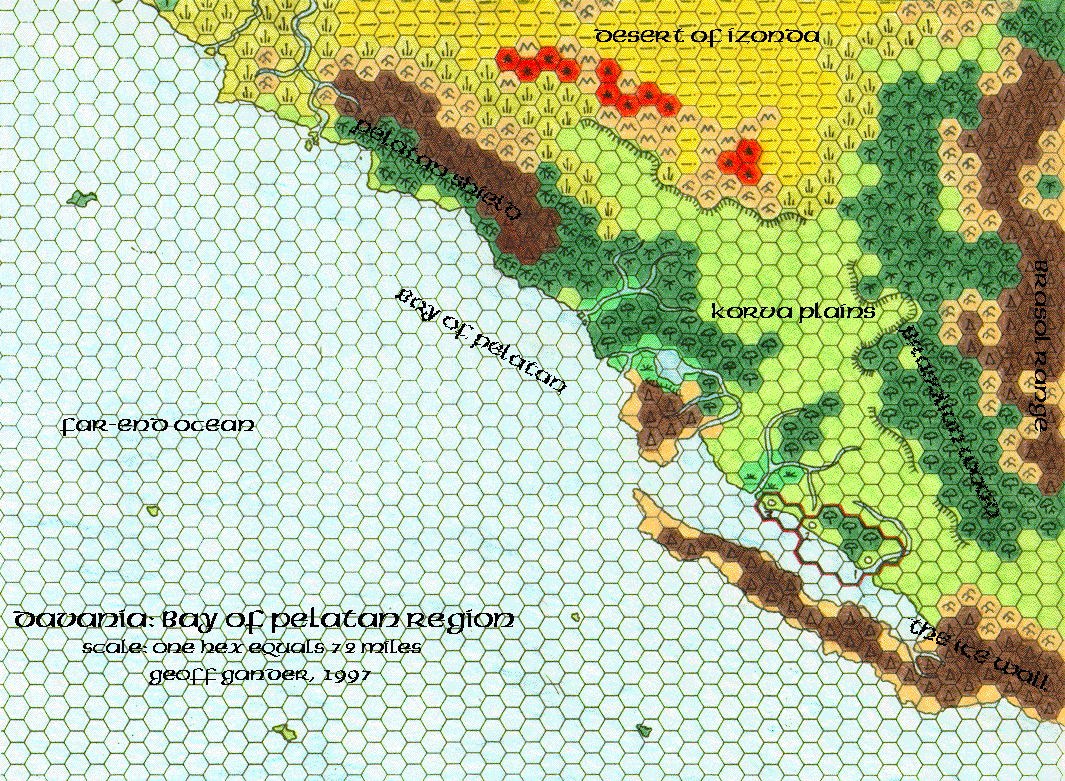 With the Bay of Pelatan Region, Geoff reached the half-way point in his mega map of the continent of Davania. This was also the first fan-made map to tackle the extreme south of the world, though there would of course be many more in future years.