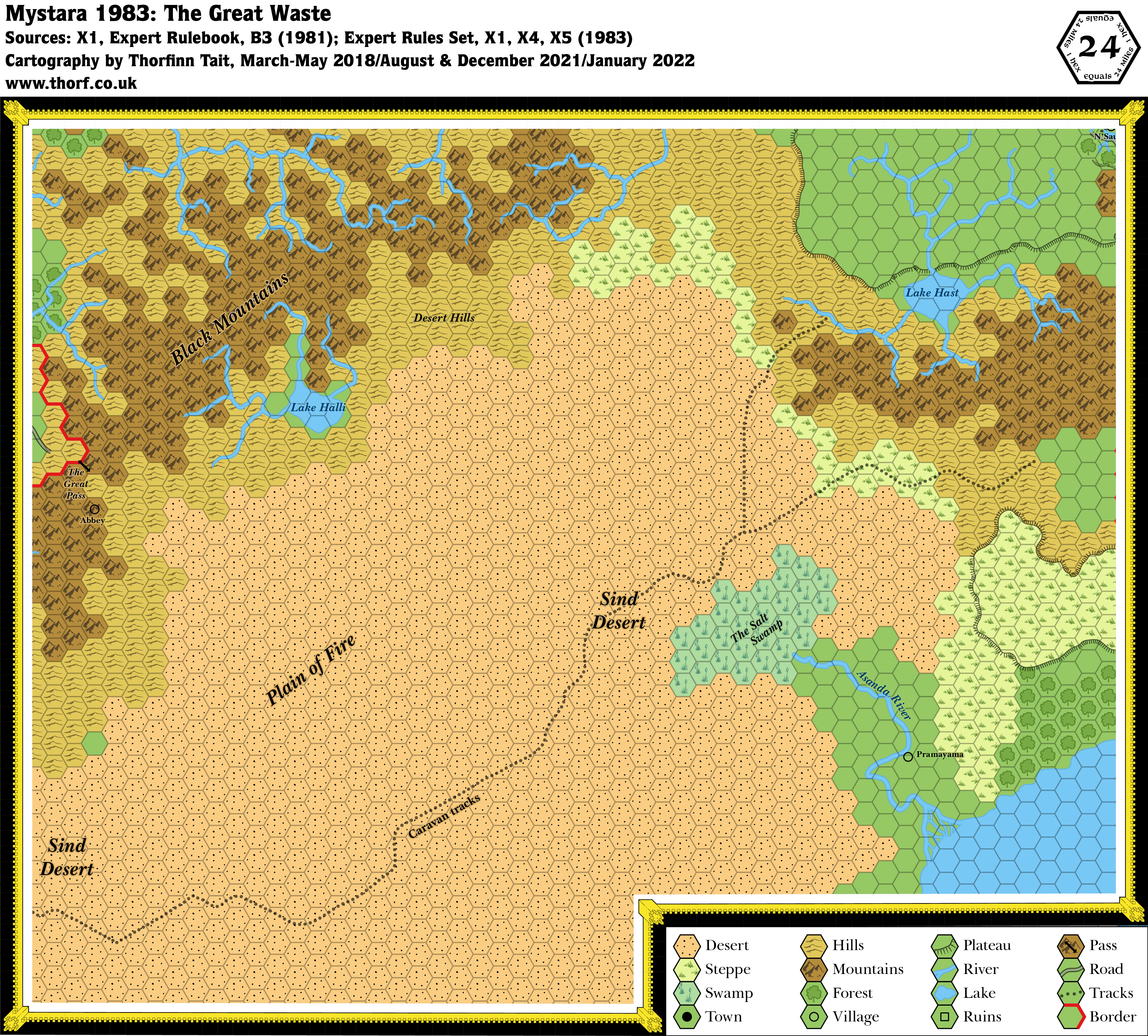 The Great Waste was the first area added to Mystara outside the Known World. Actually, X4’s map finished off the western edge of the Known World, providing the first view of the other half of Atruaghin, as well as Darokin’s far western border, before expanding out into the Sind Desert. Since it’s a desert, the map ended up being rather empty, although the module’s titular “Desert Nomads” presumably inhabit at least some of the spaces of this map.