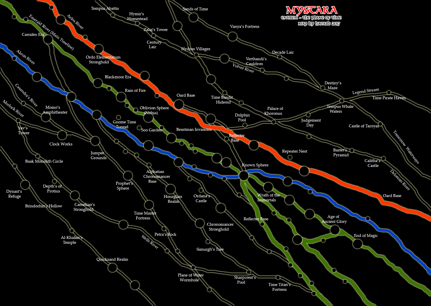 This is a rather cool map, conceptualising the Plane of Time mentioned in Wrath of the Immortals. The lines are rivers, connecting various events in the timeline. Everything flows from top left to bottom right, and the Main Timeline — the Emerald River from HWA3 — includes many familiar happenings from Mystaran history.