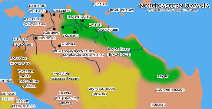 This is a “quick” map of Davania’s northeastern section, which Håvard drew in 2007. He was inspired by discussions of Vulcania at the Mystara Mailing List at the time. He assembled all of the main political and geographical labels from published sources.