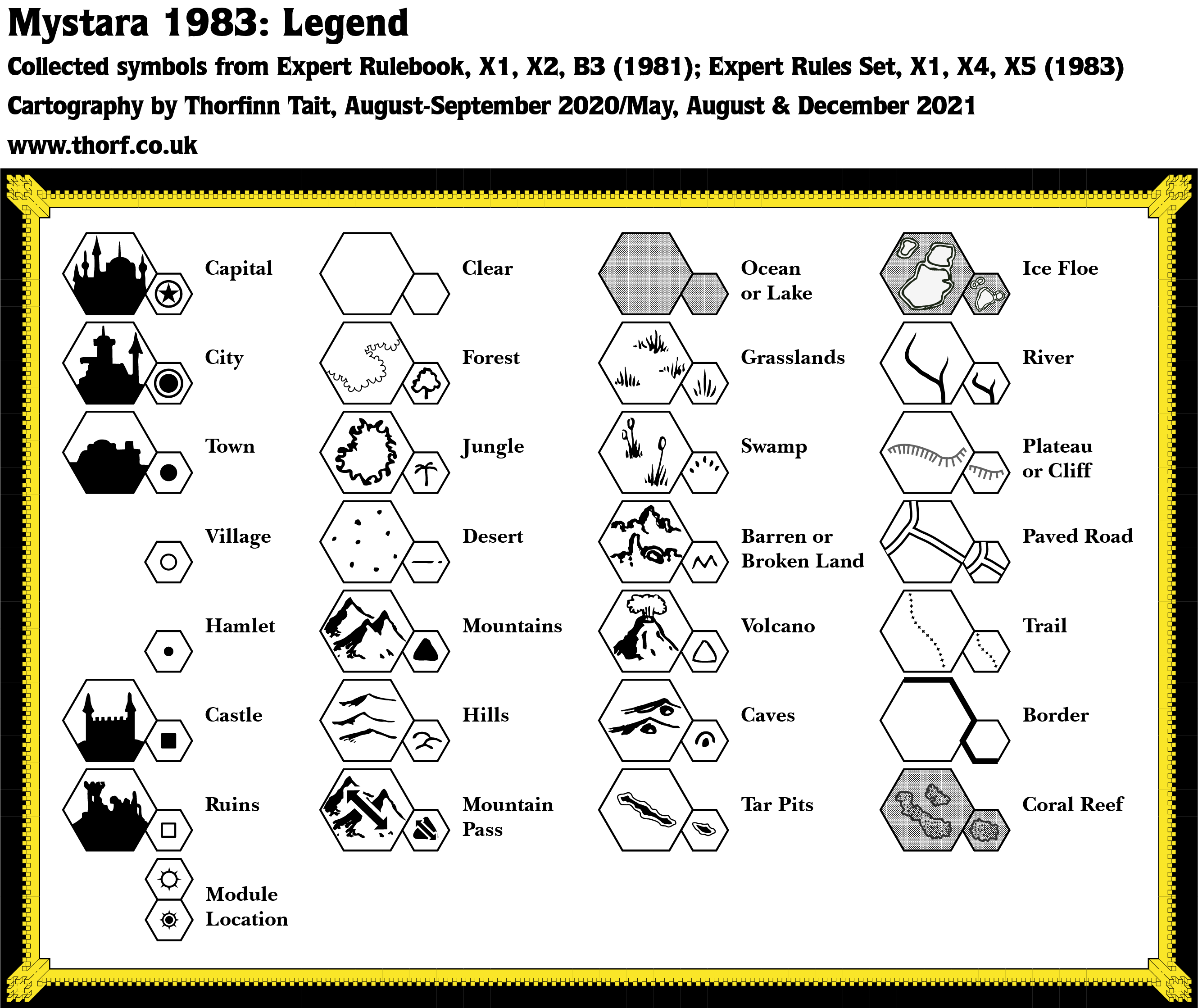 - Hex Art — Mountain Pass from X4/5, Module Location from Expert 1983. Castle and Ruins have been swapped, and are now opposite to their 1981 definitions.