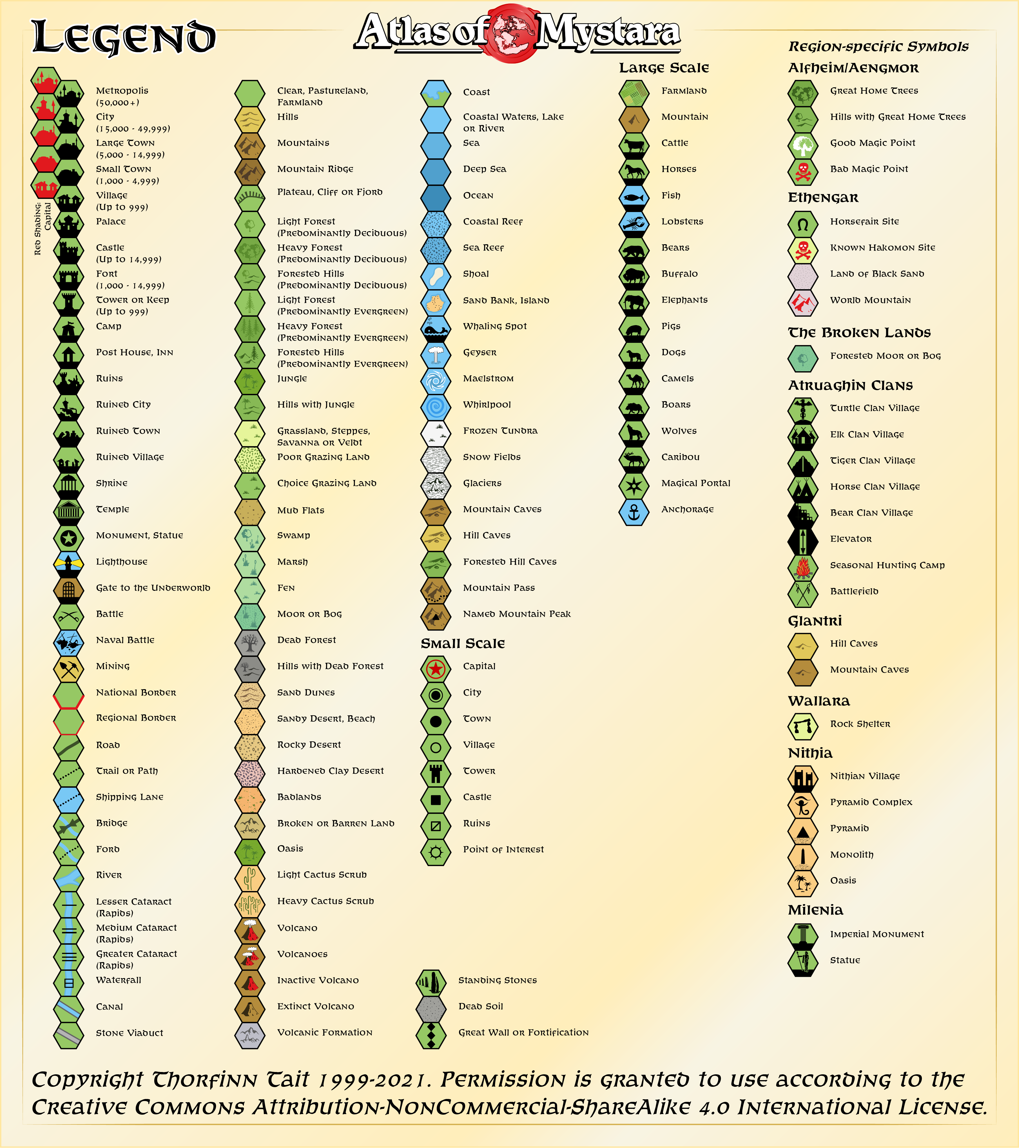 The Atlas of Mystara began with the posting of excerpts from its symbol set, back in early 2005. Shortly afterwards I posted a full legend, but it has been rather neglected over the years. This image is an attempt to fix that, providing the Atlas with a proper, nice-looking legend for the first time.