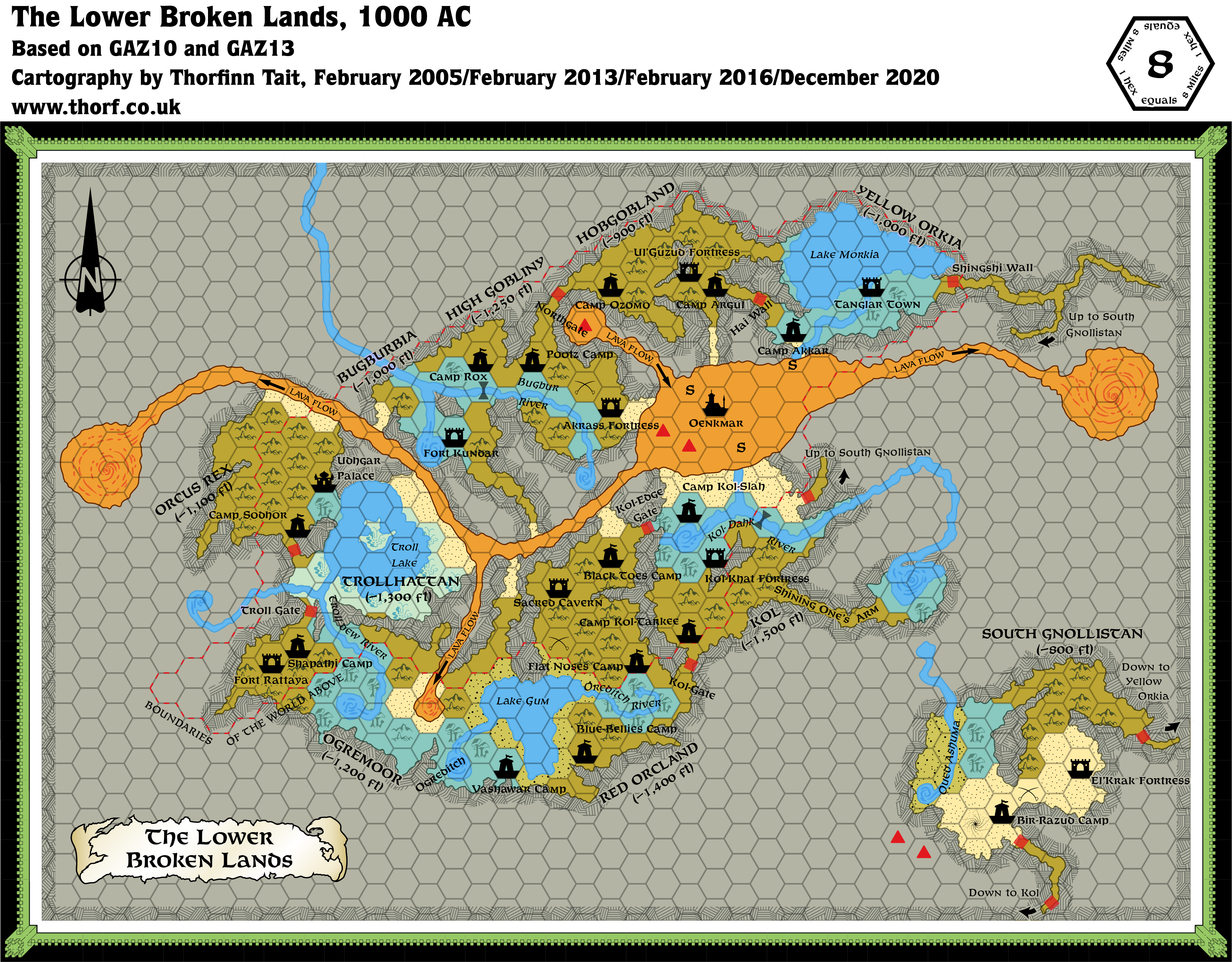 The Lower Broken Lands map was Mystara’s first fully detailed underground hex map. It was followed soon after by GAZ13’s map, which inexplicably changed the palette quite drastically. The Atlas uses a standardised hybrid of GAZ13’s and GAZ10’s palettes.