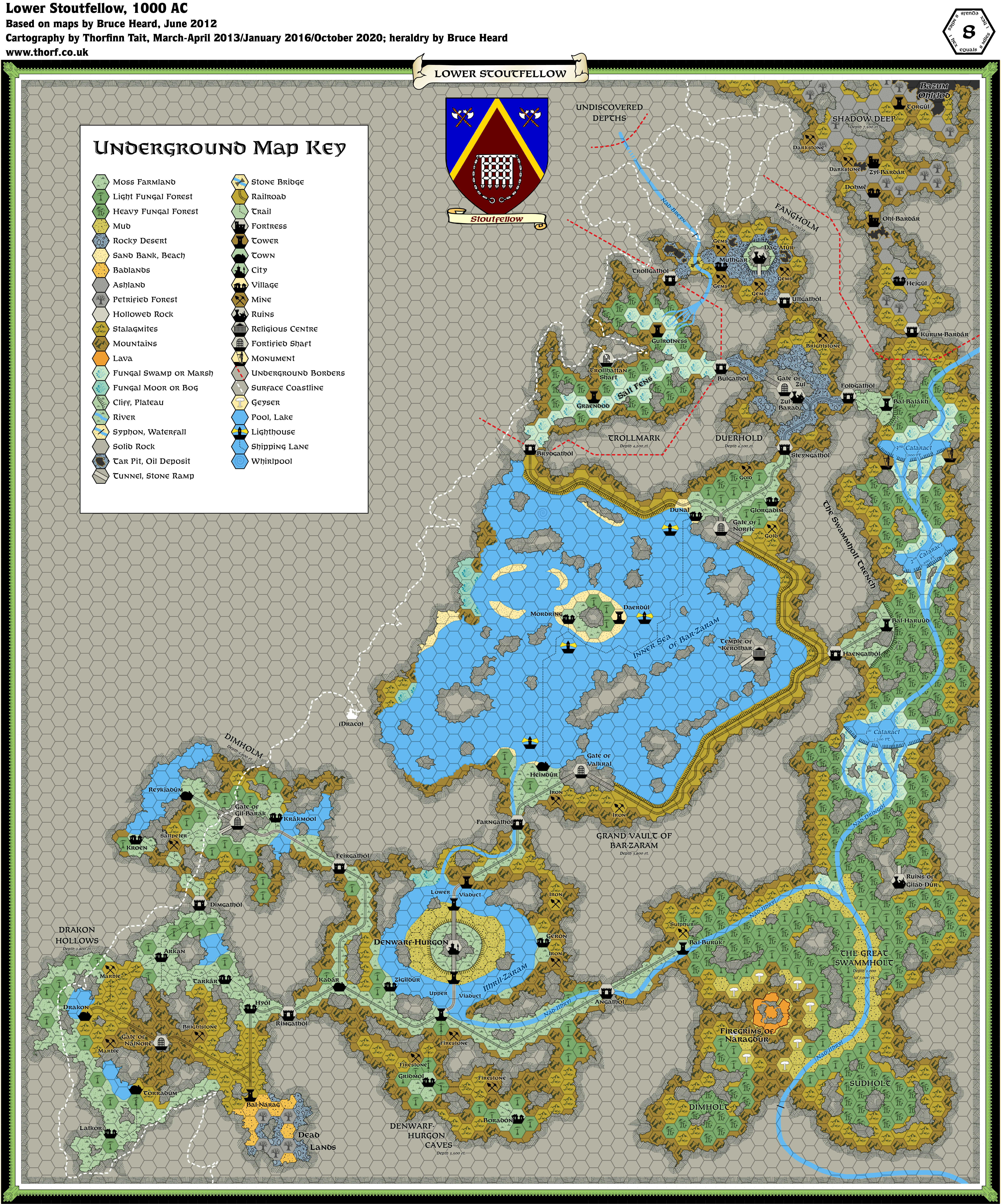 - Lower Stoutfellow, 8 mile per hex map by Bruce Heard (2012)