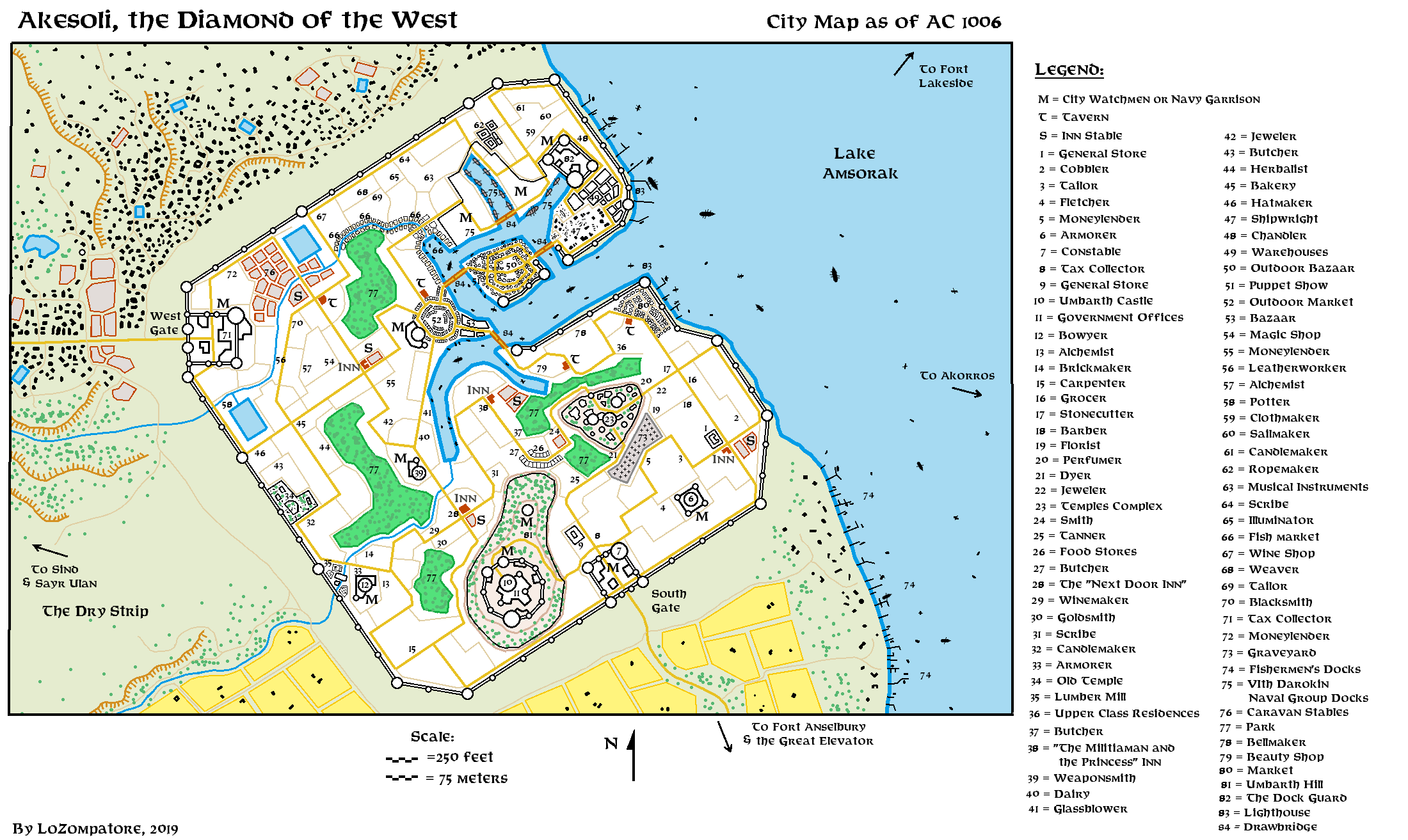 Michele designed this map to show the changes in Akesoli due to the Hulean invasion of Sind. It was a stepping stone between the Gazetteer setting of 1,000 AC (as depicted in his previous map) and the Poor Wizard’s Almanac of 1,010 AC. Over that period, various events influenced the city, including wars and their resulting refugees.