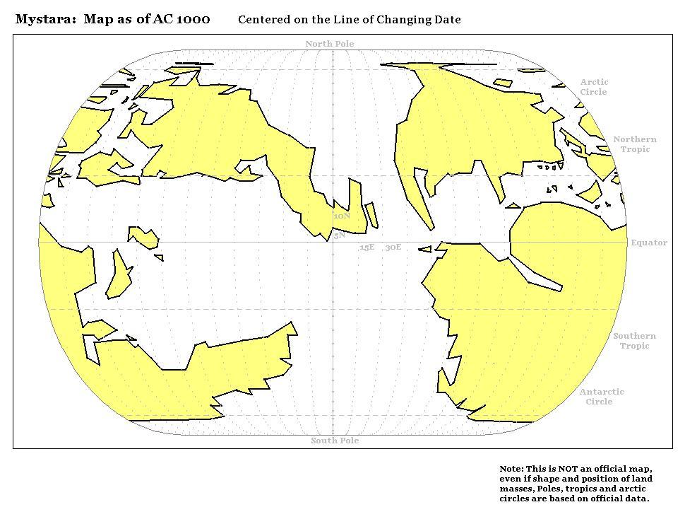 Mystara but not as we know it – this map is the same old familiar world map that Michele depicted, but recentred on the international date line, 180 degrees E/W. Thus, Tangor and Zyxl appear in the middle, with all the major continents around the edges, and Davania split in two. Since Michele produced a similar variant for his precataclysmic series, this map was likely inspired by that.