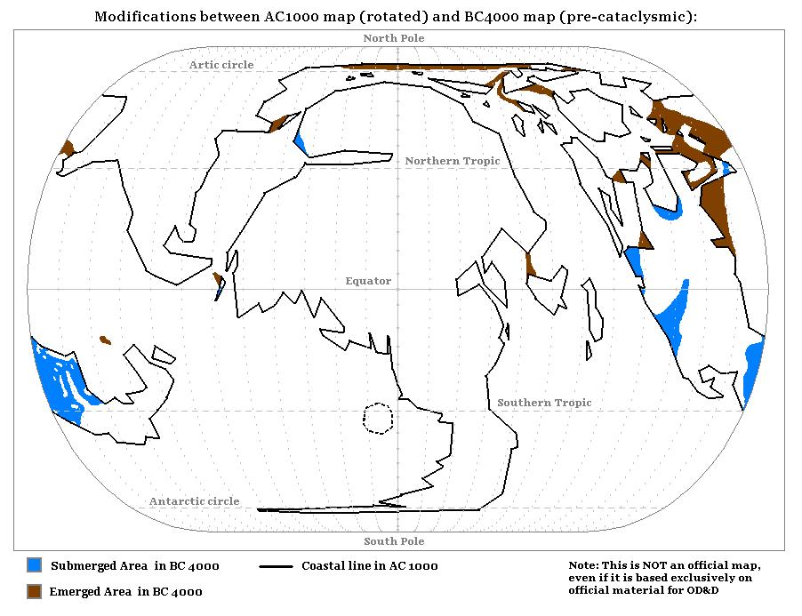 …a map showing the modifications of coastline and continents after the Great Rain of Fire. I drew this map comparing the coastlines shown in the HW pre-cataclysmic map with the modern coastlines; then I added these modifications to the map of ‘rotated’ Mystara (which is based on the modern shape of continents) I calculated.