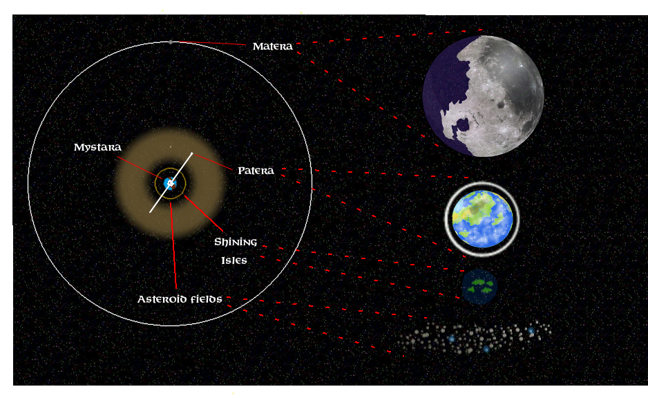 This diagram shows Mystara together with its moons and other satellites. The art for Matera and Patera is based on Michele’s own maps for the moons.