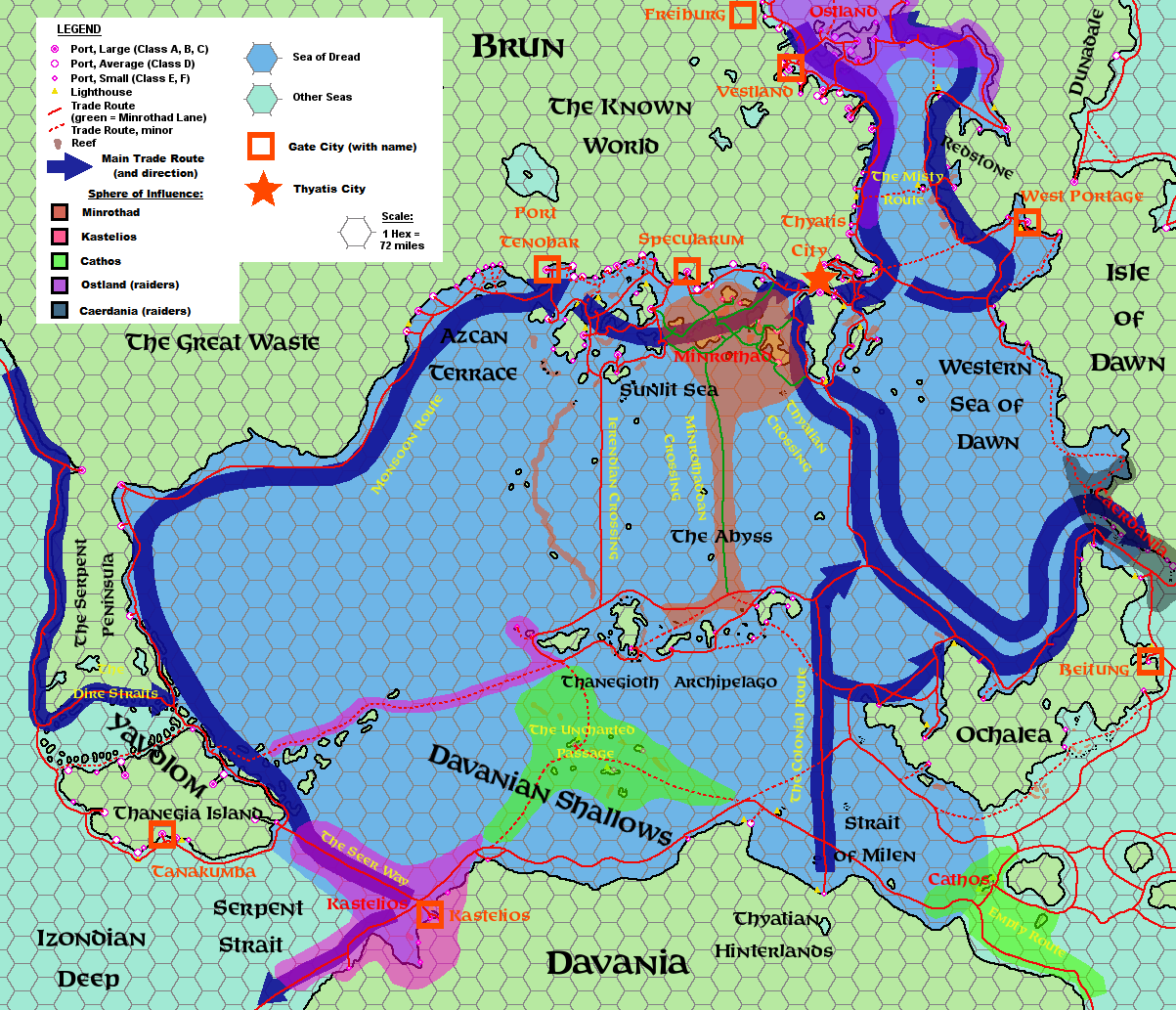 The third map from Michele’s Advice for traders in the Sea of Dread in Threshold #4 was a variant of the first. While that map focused on Trade Routes and possible dangers to navigation, this one put the major trading ports, labelled here as Gate Cities, front and centre. It then clarified the shipping lanes, noting their direction as well as the various spheres of influence in play in the region.