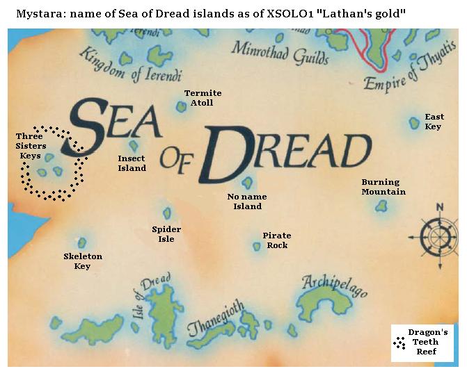 Back in November 2005, Michele assembled this annotated excerpt of XSOLO’s Sea of Dread map, using the text of the adventure to add names and a few other features to the map. Many years later I did the same thing myself, although I chose to add the details to the hex map, for which see Known World, 24 miles per hex (1984). Michele’s version differs from mine only in one key aspect: he interpreted the Dragon’s Teeth Reef as a circle surrounding the Three Sisters Keys, whereas later I took it to be the line delineated in X7. Most likely, Michele did not have access to X7 when he made this map.