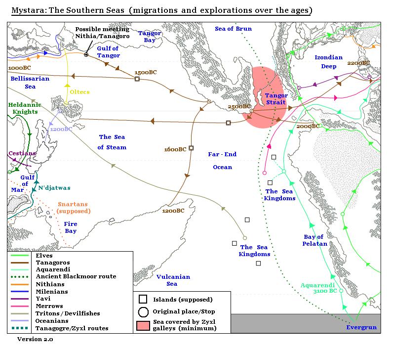 After exploring Vulcanian Settlements, Michele next turned his sight to migrations in and around Mystara’s “southern seas”, by which he mostly meant the Sea of Steam and the Far End Ocean. As always for Davania, the amount of official information available was limited, but he brought together all the relevant sources (listed in his MMB post, and of course in Sources below).