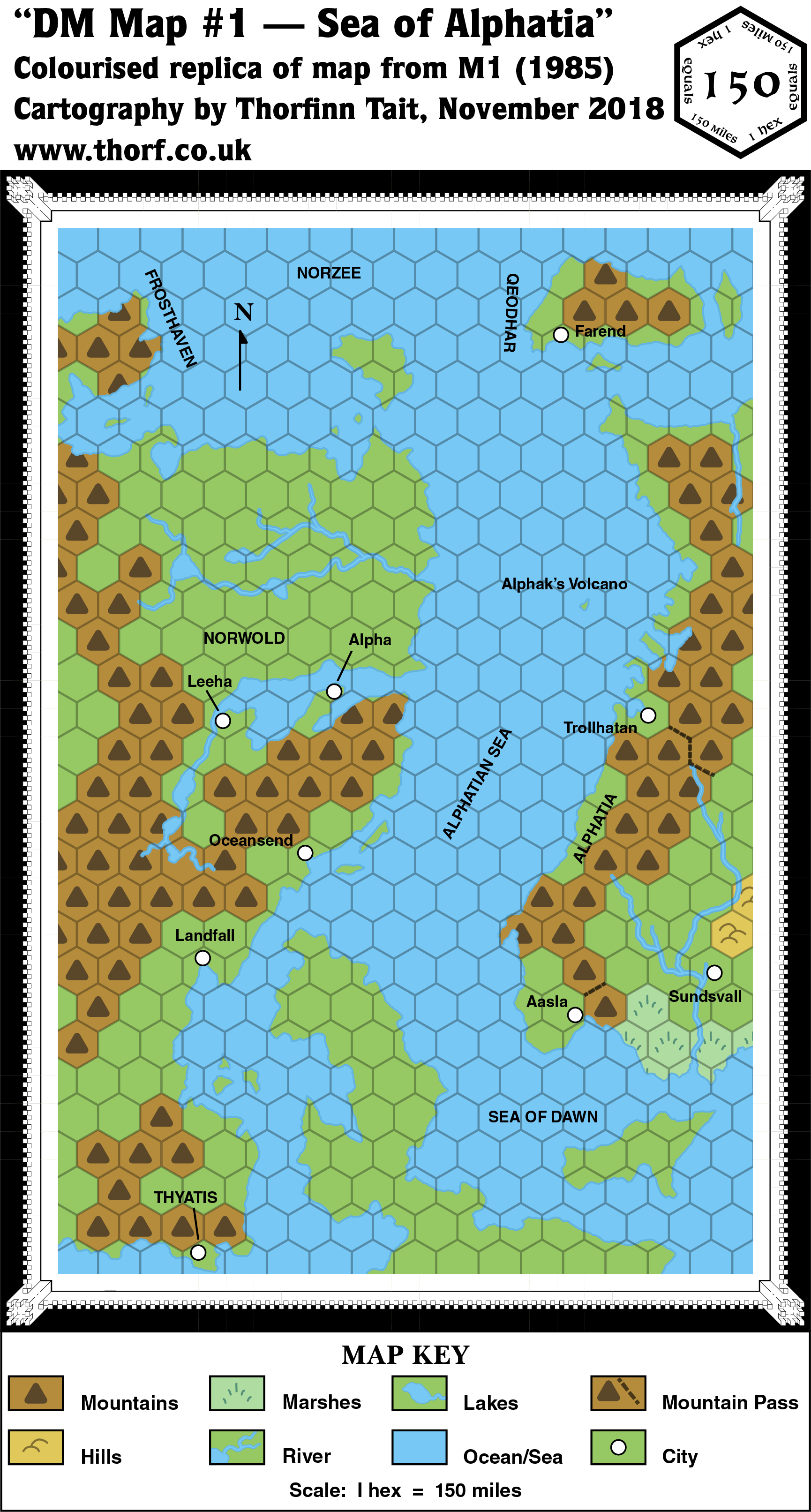 - Scale — This small scale map of Norwold had a unique scale that would never be used again in published maps. It’s the most zoomed out hex map in Mystara’s history. Unfortunately, comparison with previous maps of the area indicates that the scale is in fact not 150 miles per hex; instead, a scale of about 138 miles per hex facilitates compatibility with other maps.