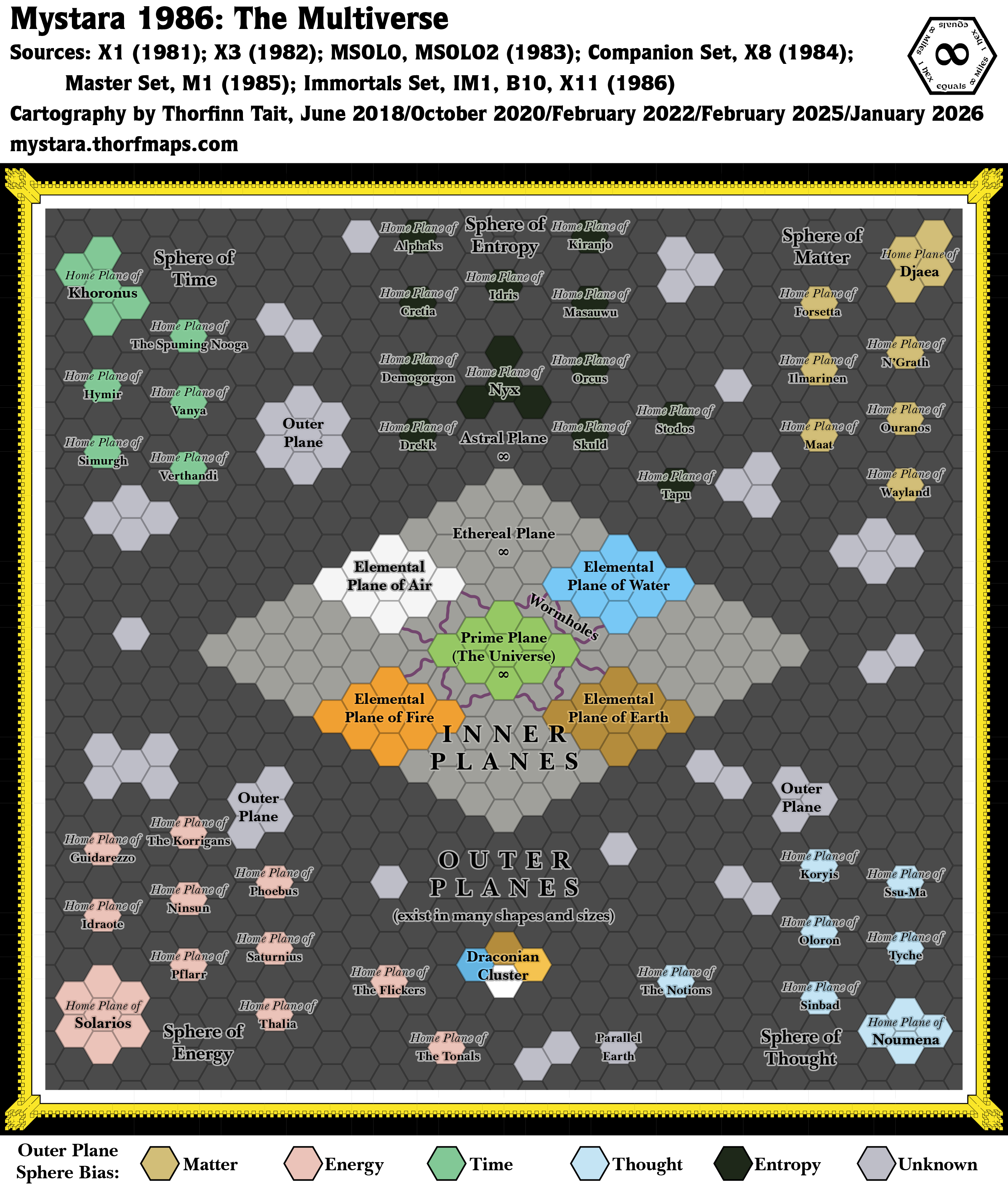 The Immortals Set also added the idea of finite and infinite planes. This unfortunately makes my “1 hex equals infinity miles” scale wrong, and to reflect this I have included an infinity symbol beneath the names of each of the infinite planes.