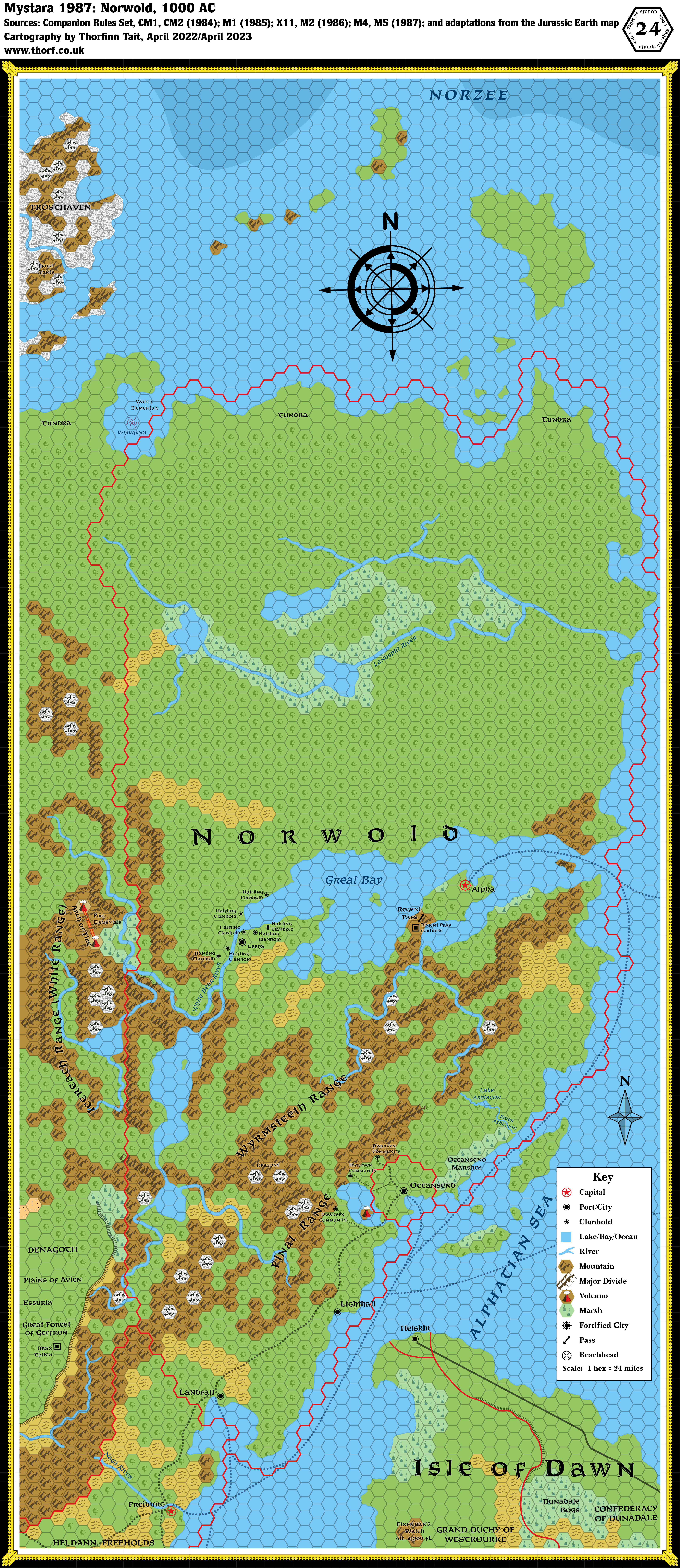Note: This is the main Norwold map, complete with its original rotation, making it misaligned from the rest of Brun’s hex grid. It is the most accurate map of Norwold for this time period, but it doesn’t join up easily with maps for adjacent areas. There is also a realigned version of this map.
