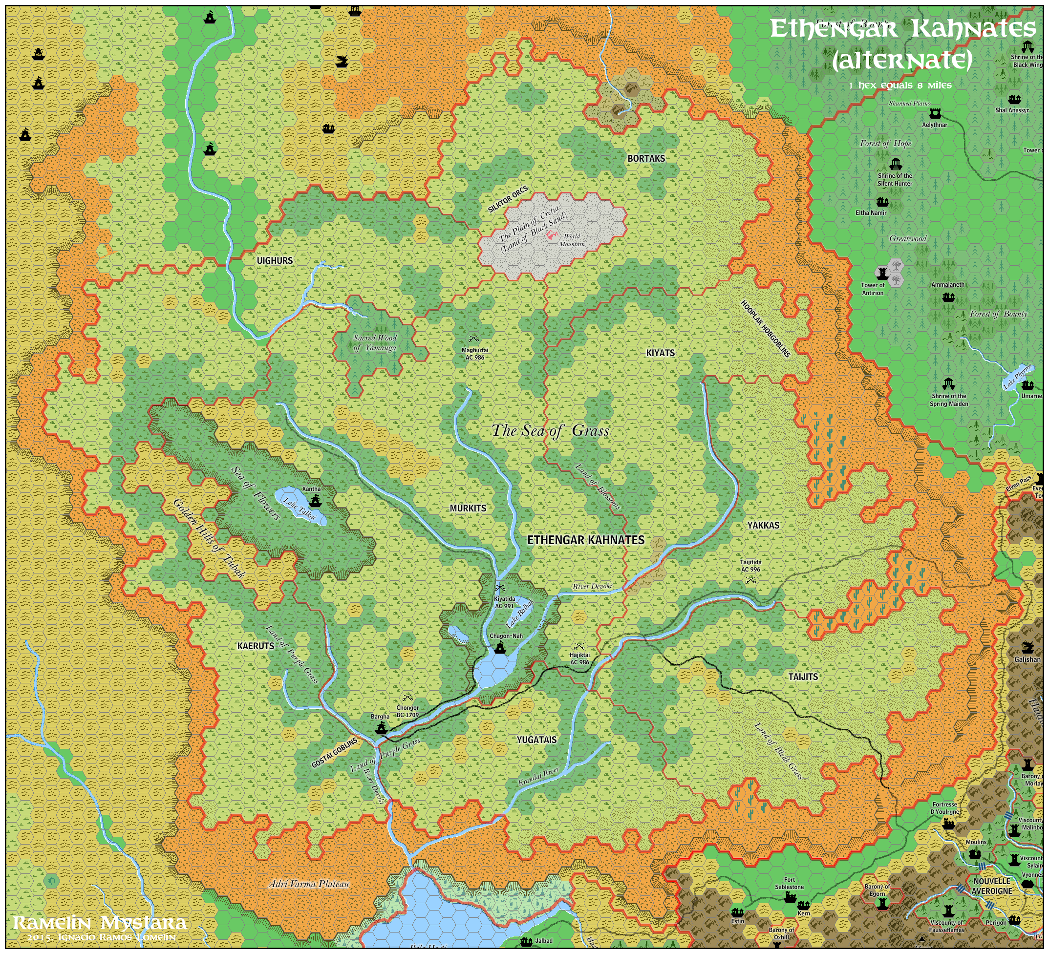 This is a fan-made map. It was published in November 2015. The updated Atlas version of Ethengar is Ethengar, 8 miles per hex. See also Appendix C for annual chronological snapshots of the area. For the full context of this map in Mystara’s publication history, see the upcoming Let’s Map Mystara 2015.