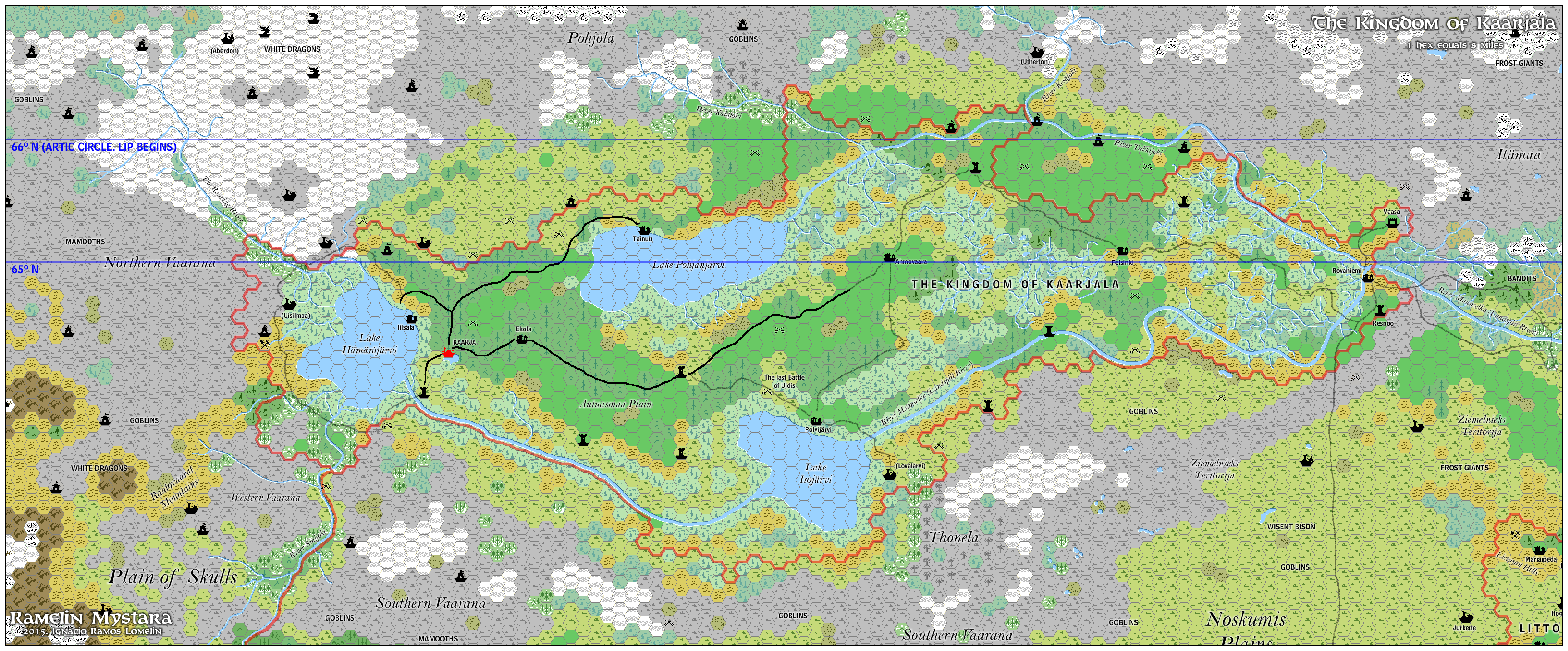 As he did with Geoff’s Littonia, he faithfully recreated JTR’s original Kaarjala map, expanding it just slightly to the east to allow the corner of Littonia to be visible on the edge.