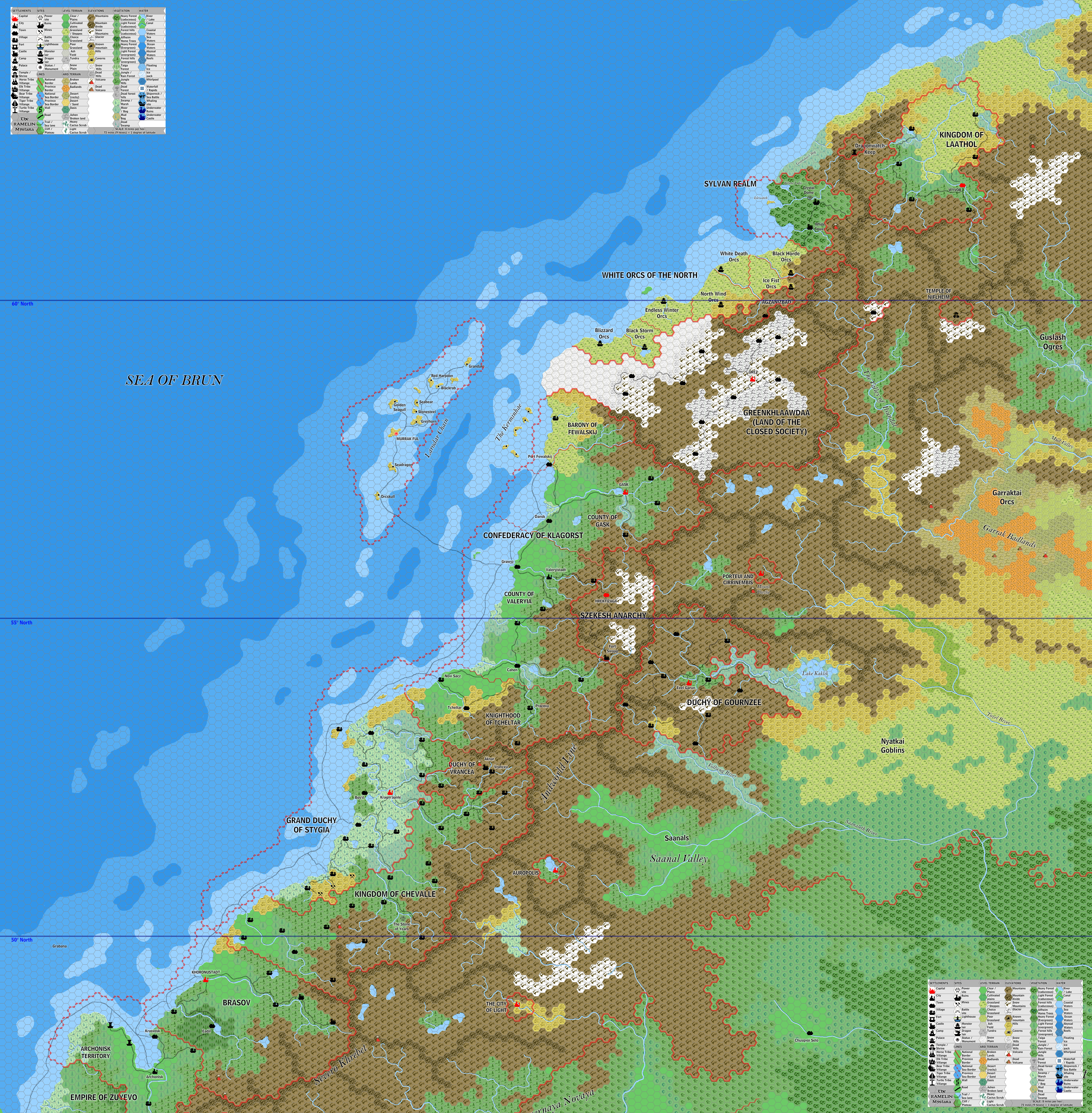 With this map of the Klagorst region, Jose completed the last piece of western Brun at 8 miles per hex. Only Hyborea remained to finish the entire western coast up to the frozen north.