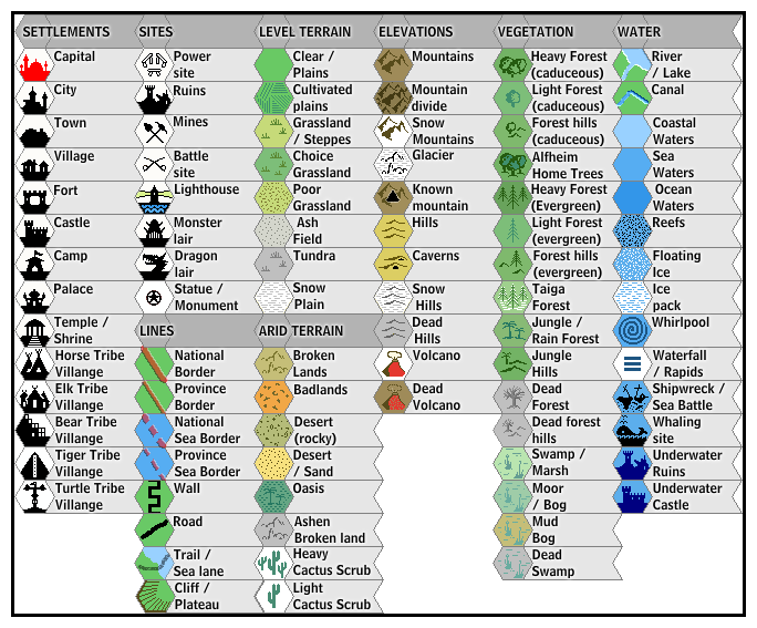 His new symbols of note were: Power Site (a henge monument), Monster Lair (an adaptation of an earlier fan symbol), Dragon Lair, Cultivated Plains (a farmland hex), Mountain Divide, Snow Mountains, Snow Hills, Dead Hills, Taiga Forest, Mud Bog, Dead Swamp, Floating Ice, and Ice Pack. Some of these had previously appeared in other fan-made maps, but many were his own innovations.