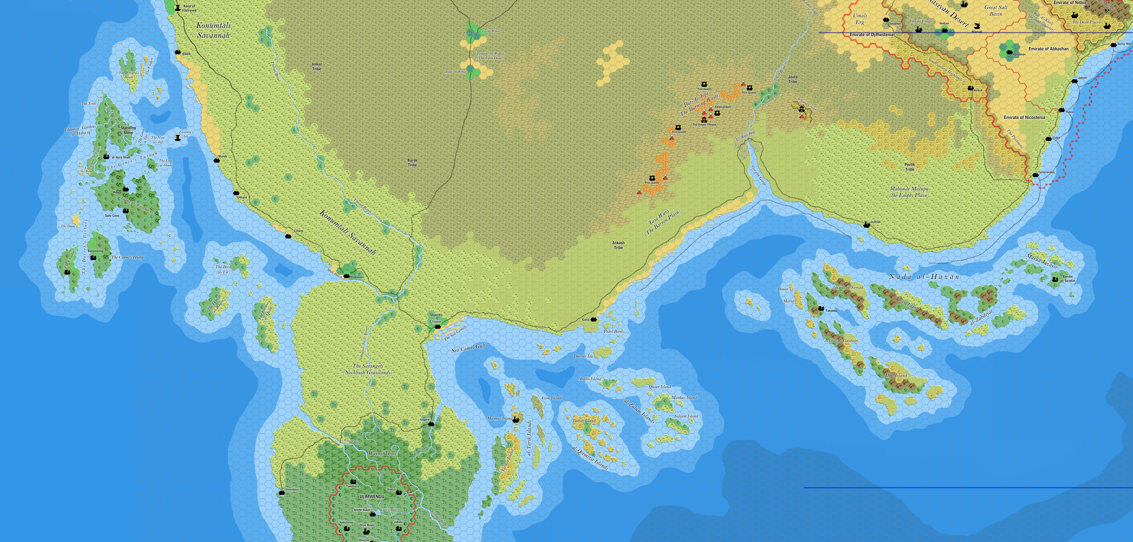 Having already moved Ylaruam into the Great Waste, Jose then decided to make another addition in the form of three separate groups of islands: one at each side of The Neck of the Serpent Peninsula, and another south of the Great Waste.