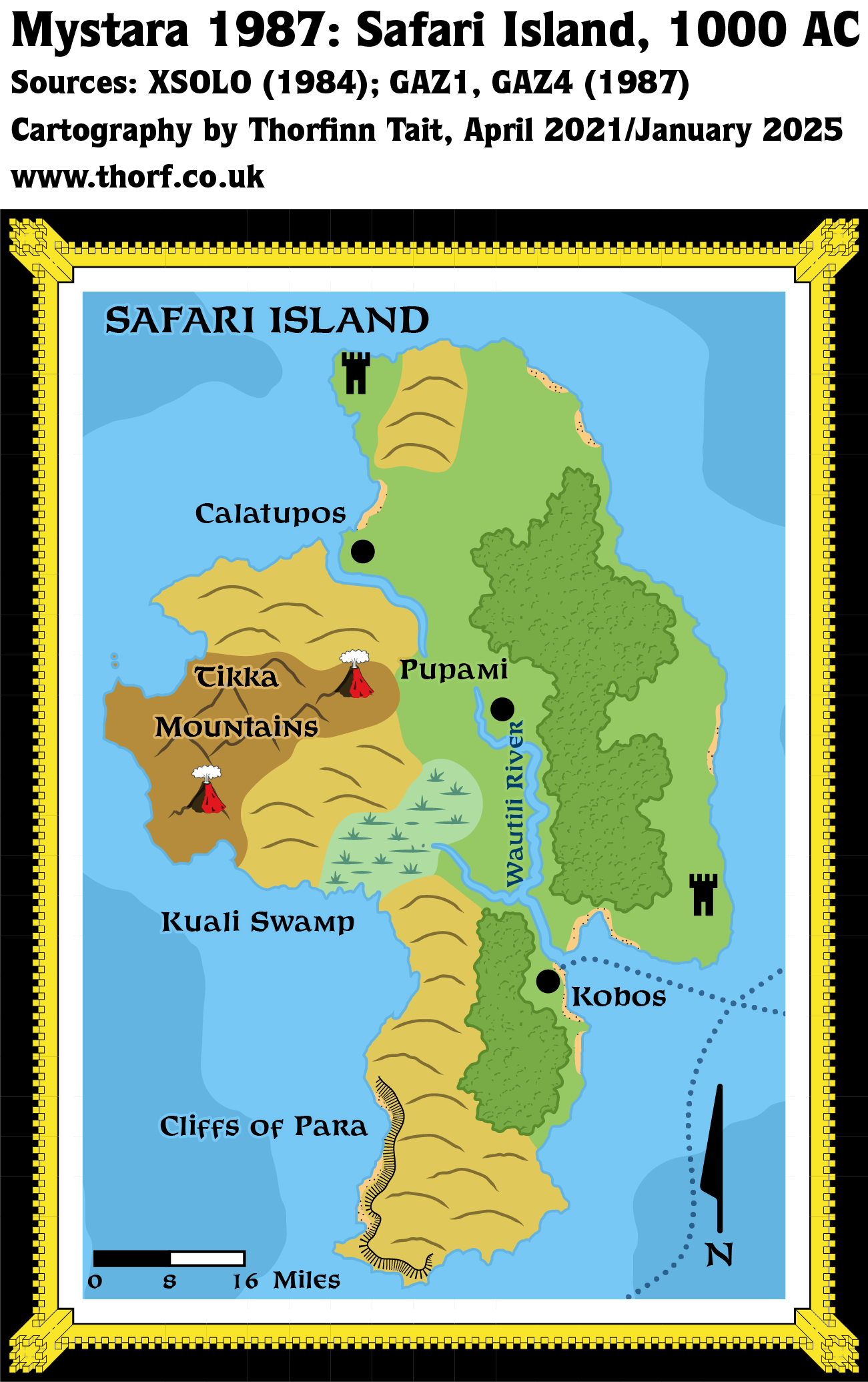 GAZ4 introduced a detailed map of Safari Island, although it was missing a few details that were present on the 8 mile per hex poster map. Namely, the towers, the volcanoes, and the sea depths were not included. This map presents a view of how Safari Island might have been mapped at the end of 1987, with these details as well as the shipping lanes added in. As with the hex map, the towers remained nameless at this point.