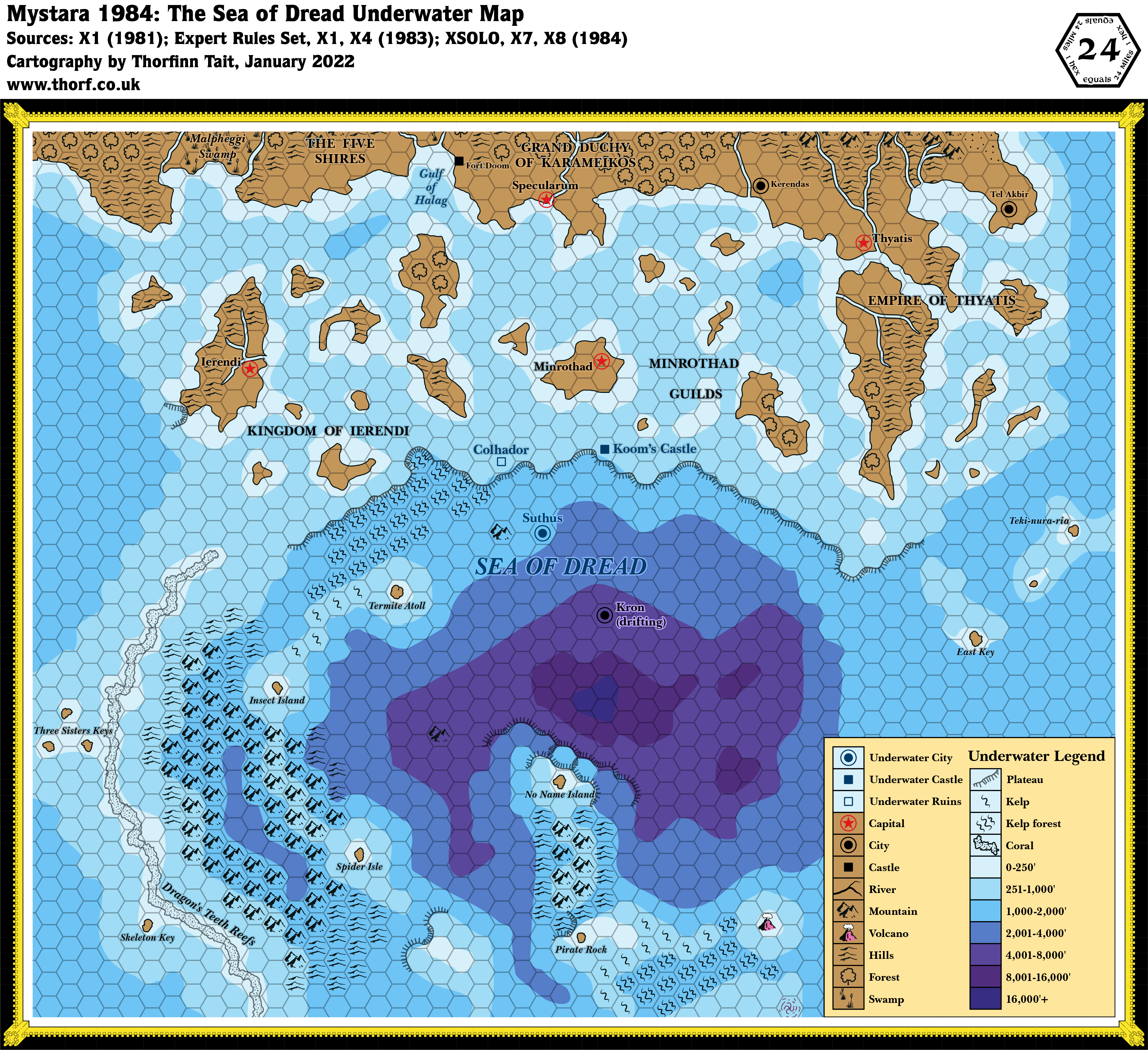 The updated version below uses standardised coastlines and rivers from the Brun, 24 miles per hex 1984 map. The islands also match that map precisely. It also had smoothed out depths in place of X7’s hex-shaped system. Finally, I have added in labels for the countries and settlements around the Sea of Dread.