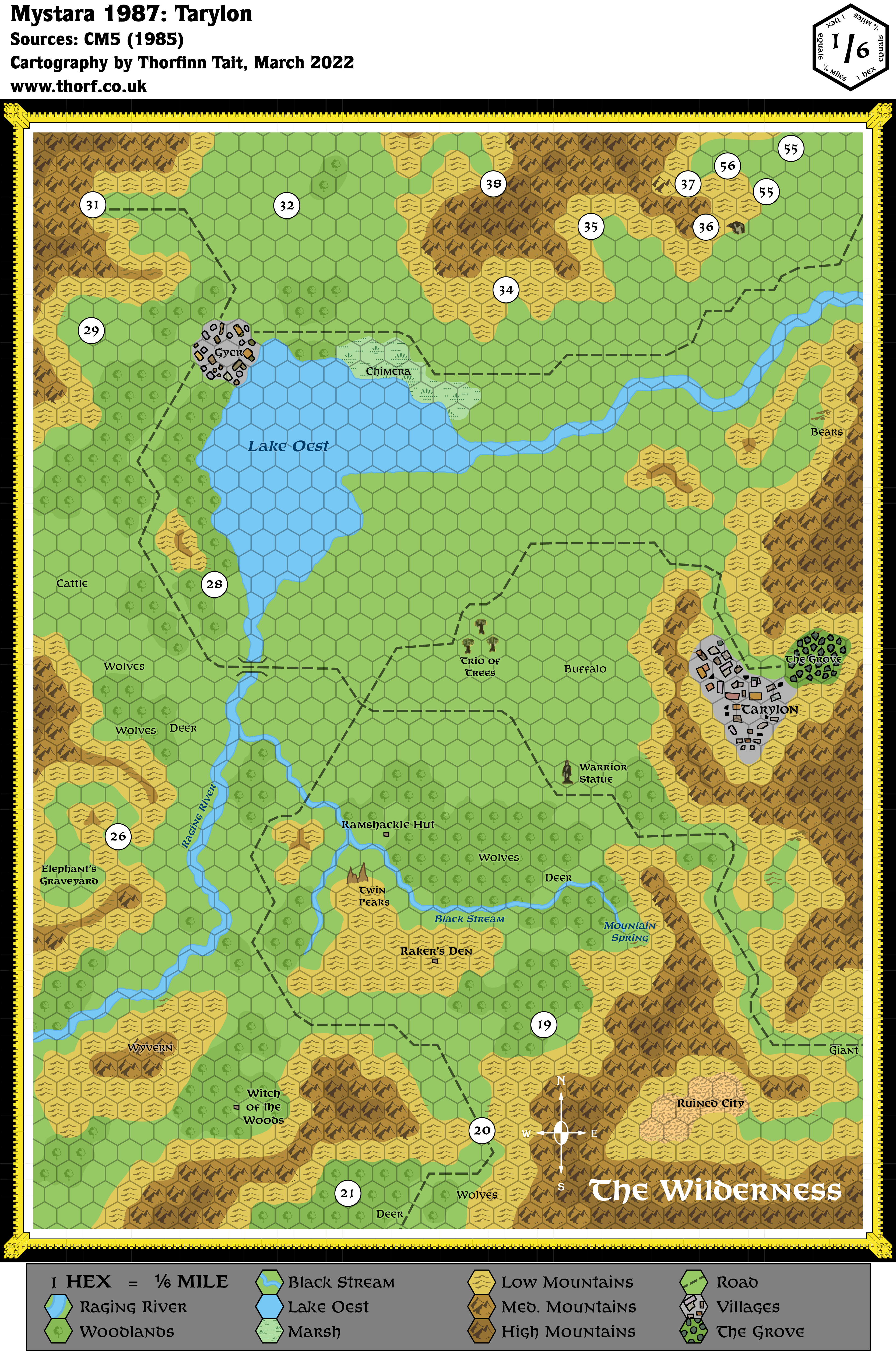 This region was never mentioned again after CM5, so there are no updates to the map content. Instead, this version brings it in line with the Gazetteer-style hex art and fonts that debuted in 1987.